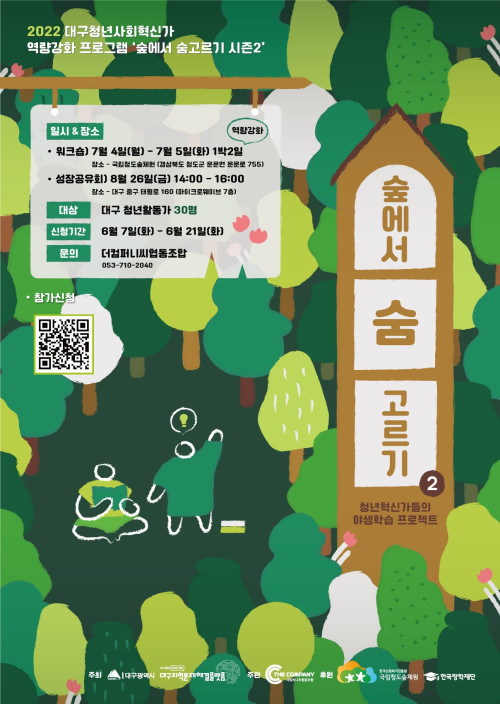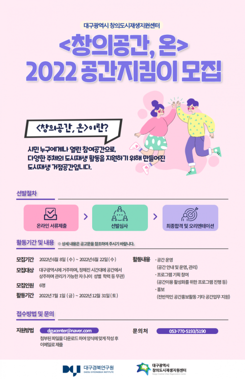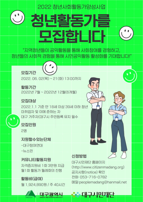 현재 모집 중 검색폼 대구광역시는 해당 페이지를 정보제공을 위한 목적으로 플랫폼을 운영하며, 각 게시글의 내용 및 운영방침에 대한 책임을 지지 않습니다. 대구광역시청년센터 사업 모아보기 전체보기 분야 : 전체 지원사업 채용/인턴/알바 기자단/서포터즈/자원봉사 공모전 교육/강연/토론 축제/공연/전시 커뮤니티활동 기타 정렬 : 전체 신규등록순 모집마감순 상태 : 전체 진행중 종료 기간 설정 검색 검색어 입력 꿀정보등록 누구나 쉽고 빠르게 청년정보를 등록하여 홍보할 수 있습니다. 전체선택 종료 대구 모집] 기후 생각 강의, 기후의 밤 참여자 모집 (~6/23) 어울리, 토핑 ~ 2022.06.23 종료 [인공지능&빅데이터] 기업 맞춤형 실무 인재 양성 과정 모집 대구디지털산업진흥원 ~ 2022.06.23 종료 2022년 대구광역시 동구 청년도전지원사업 대구 동구청년센터 the꿈 ~ 2022.06.22 종료 2022 하반기 <창의공간, 온> 공간지킴이 모집 대구광역시 창의도시재생지원센터 ~ 2022.06.22 종료 2022 아르바이트 최저임금 실태조사 사단법인 유니온센터 ~ 2022.06.21 종료 <2022청년 혁신가들의 야생학습 프로젝트> 대구지역문제해결플랫폼 ~ 2022.06.21 종료 [대구시민재단] 2022년 청년사회활동가양성사업 5차 추가청년 모집 (사)대구시민재단 ~ 2022.06.21 종료 [모집] 대구굿즈와 함께하는 북성로 관광기념품 굿즈 만들기! 대구굿즈 ~ 2022.06.20 621 622 623 624 625 626 627 628 629 630