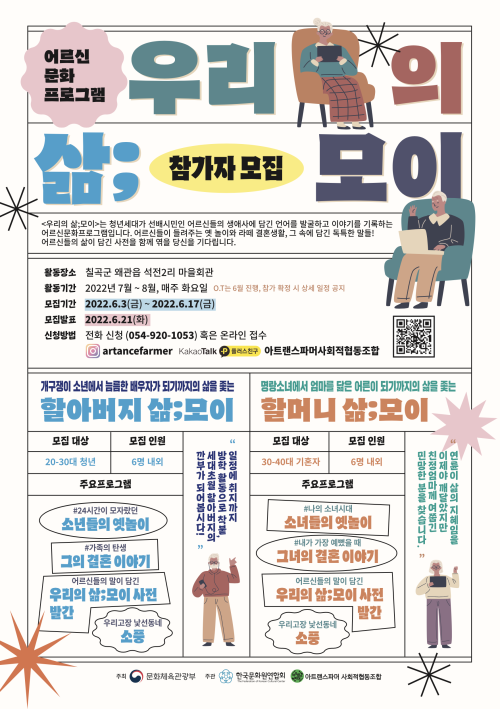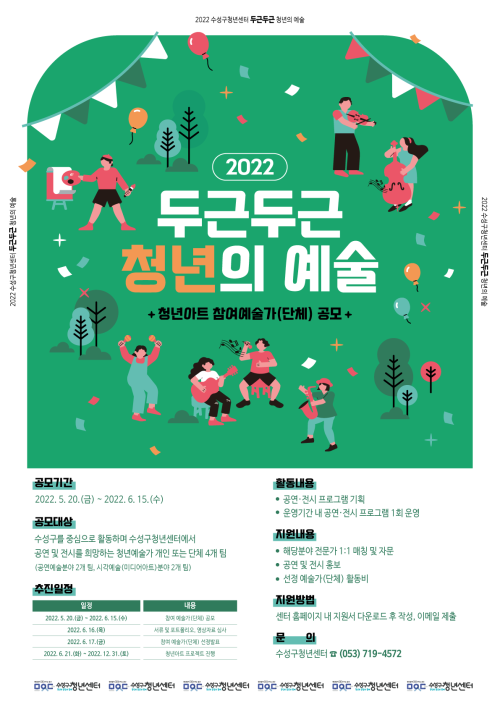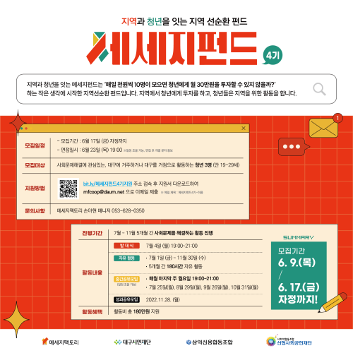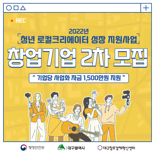 현재 모집 중 검색폼 대구광역시는 해당 페이지를 정보제공을 위한 목적으로 플랫폼을 운영하며, 각 게시글의 내용 및 운영방침에 대한 책임을 지지 않습니다. 대구광역시청년센터 사업 모아보기 전체보기 분야 : 전체 지원사업 채용/인턴/알바 기자단/서포터즈/자원봉사 공모전 교육/강연/토론 축제/공연/전시 커뮤니티활동 기타 정렬 : 전체 신규등록순 모집마감순 상태 : 전체 진행중 종료 기간 설정 검색 검색어 입력 꿀정보등록 누구나 쉽고 빠르게 청년정보를 등록하여 홍보할 수 있습니다. 전체선택 종료 청년대상 지역기반 활동지원 프로그램, 메세지펀드 4기 메세지팩토리협동조합, 대구시민센터, 삼익신용협동조합 ~ 2022.06.17 종료 (협) 함께이룸 직원 채용공고 협동조합 함께이룸 ~ 2022.06.17 종료 [프리하게 삽니다] 프리랜서(창작자) 역량강화 워크숍 대구문화예술프리랜서협동조합 ~ 2022.06.17 종료 2022 어르신문화프로그램 <우리의 삶;모이> 참가자 모집 문화체육관광부 주최 / 한국문화원연합회, 아트랜스파머 공동주관 ~ 2022.06.17 종료 2022 우공이산 인문도서관 콰타드림랩 ~ 2022.06.16 종료 2022 「청년 로컬크리에이터 성장 지원사업」 창업기업 2차 모집 공고 (재)대구창조경제혁신센터 ~ 2022.06.16 종료 2022 수성구청년센터 두근두근 청년의 예술 수성구청년센터 ~ 2022.06.15 종료 패피가 될래요! 느린옷장 사연 모집 다양한 움직임; 다움 ~ 2022.06.15 621 622 623 624 625 626 627 628 629 630