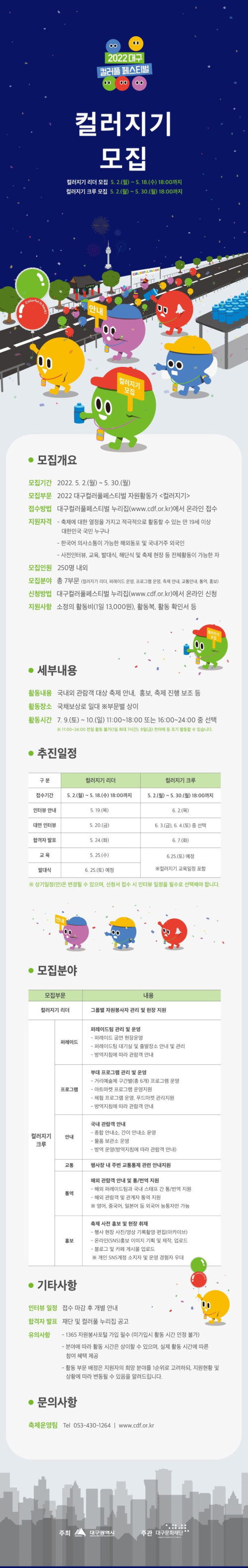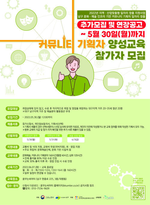 현재 모집 중 검색폼 대구광역시는 해당 페이지를 정보제공을 위한 목적으로 플랫폼을 운영하며, 각 게시글의 내용 및 운영방침에 대한 책임을 지지 않습니다. 대구광역시청년센터 사업 모아보기 전체보기 분야 : 전체 지원사업 채용/인턴/알바 기자단/서포터즈/자원봉사 공모전 교육/강연/토론 축제/공연/전시 커뮤니티활동 기타 정렬 : 전체 신규등록순 모집마감순 상태 : 전체 진행중 종료 기간 설정 검색 검색어 입력 꿀정보등록 누구나 쉽고 빠르게 청년정보를 등록하여 홍보할 수 있습니다. 전체선택 종료 2022 찾아가는 폭력예방교육 대구여성가족재단 ~ 2022.05.31 종료 [취업연계 프로그램] 문화·예술 인프라 기반 <커뮤니티 기획자 양성교육> 참여자 추가 모집 (사)한국문화공동체 비오케이, 꿈꾸는씨어터(주) ~ 2022.05.30 종료 2022 대구 컬러풀 페스티벌 '컬러지기' 모집 대구문화재단 ~ 2022.05.30 종료 2022 스마트 공유공간 시스템 지원 사업 공개모집 대구시민재단 공유대구사업팀 ~ 2022.05.29 종료 2022 스마트 공유공간 시스템 지원 사업 공개모집 대구시민재단 공유대구사업팀 ~ 2022.05.29 종료 2022년 창조도시 미래전환학교 교육 참여자 모집 공고 (재)대구테크노파크 ~ 2022.05.29 종료 2022 스마트 공유공간 시스템 지원 사업 공개모집 대구시민재단 공유대구사업팀 ~ 2022.05.29 종료 지구당 <도심새탐조단> 새를 보며 생각한 것들_5월 지구당 ~ 2022.05.29 621 622 623 624 625 626 627 628 629 630