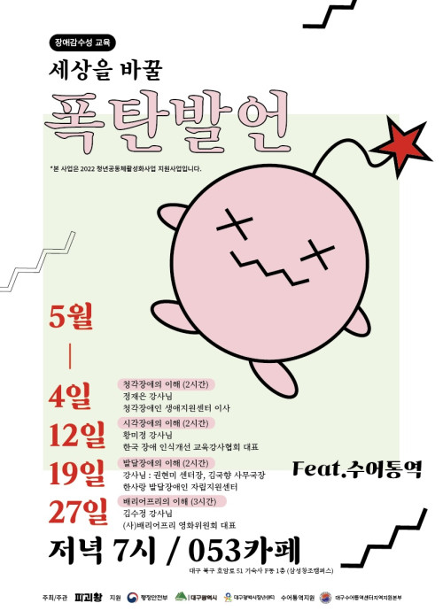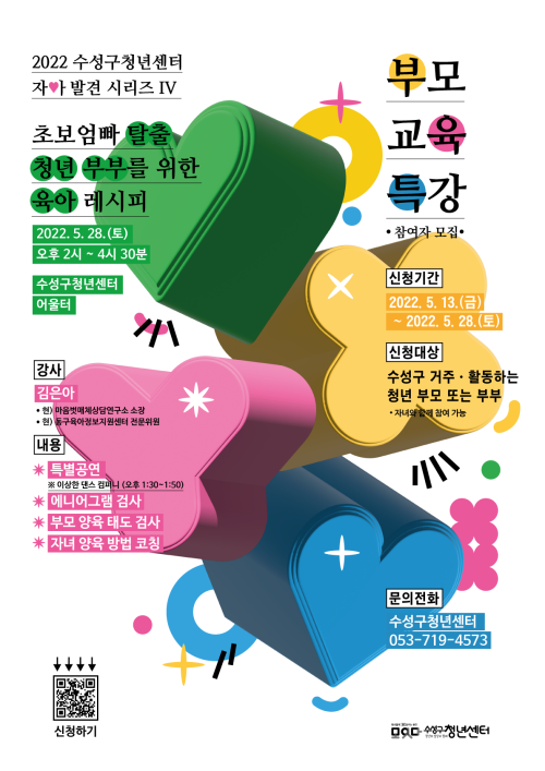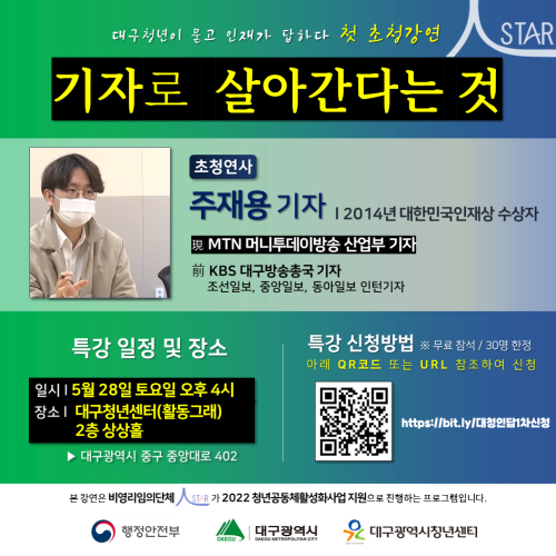현재 모집 중 검색폼 대구광역시는 해당 페이지를 정보제공을 위한 목적으로 플랫폼을 운영하며, 각 게시글의 내용 및 운영방침에 대한 책임을 지지 않습니다. 대구광역시청년센터 사업 모아보기 전체보기 분야 : 전체 지원사업 채용/인턴/알바 기자단/서포터즈/자원봉사 공모전 교육/강연/토론 축제/공연/전시 커뮤니티활동 기타 정렬 : 전체 신규등록순 모집마감순 상태 : 전체 진행중 종료 기간 설정 검색 검색어 입력 꿀정보등록 누구나 쉽고 빠르게 청년정보를 등록하여 홍보할 수 있습니다. 전체선택 종료 바리바리장터 대구녹색소비자연대 ~ 2022.05.28 종료 초보 엄빠 탈출, 청년 부부를 위한 육아 레시피 부부 교육 특강 수성구청년센터 ~ 2022.05.28 종료 [파괴왕] 장애감수성 교육 <세상을 바꿀 폭탄 발언> 파괴왕 ~ 2022.05.27 종료 [파괴왕] 세상을 바꿀 폭탄 발언 <배리어프리의 이해> 온라인 ZOOM교육 파괴왕 ~ 2022.05.27 종료 2022년 달서구 청년도전지원사업 월성종합사회복지관 청년도전지원사업본부 ~ 2022.05.27 종료 수성구청년축제+어쩔기획단 모집 수성구청년센터 ~ 2022.05.27 종료 대구 청년이 묻고, 인재가 답하다! 人Star ~ 2022.05.27 종료 [취향의 숲] 5월 프로그램 안내 취향의 숲 ~ 2022.05.27 631 632 633 634 635 636 637 638 639 640