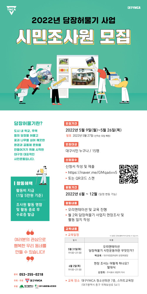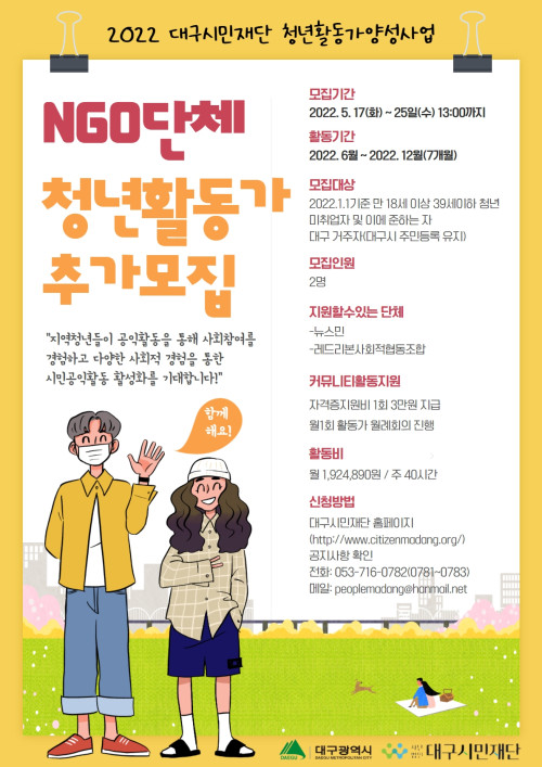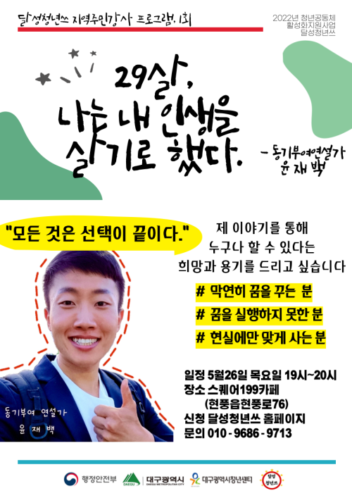 현재 모집 중 검색폼 대구광역시는 해당 페이지를 정보제공을 위한 목적으로 플랫폼을 운영하며, 각 게시글의 내용 및 운영방침에 대한 책임을 지지 않습니다. 대구광역시청년센터 사업 모아보기 전체보기 분야 : 전체 지원사업 채용/인턴/알바 기자단/서포터즈/자원봉사 공모전 교육/강연/토론 축제/공연/전시 커뮤니티활동 기타 정렬 : 전체 신규등록순 모집마감순 상태 : 전체 진행중 종료 기간 설정 검색 검색어 입력 꿀정보등록 누구나 쉽고 빠르게 청년정보를 등록하여 홍보할 수 있습니다. 전체선택 종료 2022 이공계 전문기술 연수사업 / 웹 기반 빅 데이터 분석과 시각화를 활용한 풀스택 개발자 양성과정 한국산업기술진흥협회 / 사)스마트융합기술인재개발원 ~ 2022.05.27 종료 열흘일기 이벤트 대구광역정신건강복지센터 ~ 2022.05.27 종료 2022 우공이산 인문도서관 (주)콰타드림랩 ~ 2022.05.26 종료 대구주민강사 <동기부여연설가,윤재백> 달성청년쓰 ~ 2022.05.26 종료 담장허물기사업 시민조사원 모집! 대구YMCA ~ 2022.05.26 종료 독서모임 '다향'의 멤버를 모집합니다. 다향 ~ 2022.05.26 종료 이모저모 플리마켓 이모지 ~ 2022.05.26 종료 [대구시민재단] 2022년 청년사회활동가양성사업 4차 추가청년 모집 (사)대구시민재단 ~ 2022.05.25 631 632 633 634 635 636 637 638 639 640