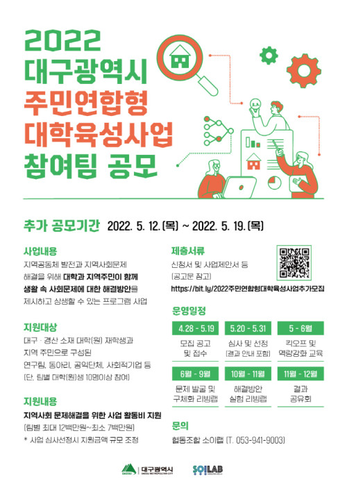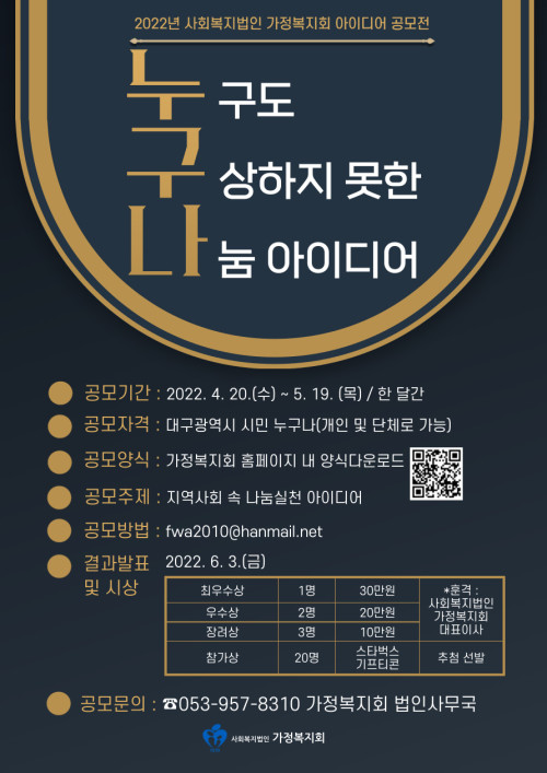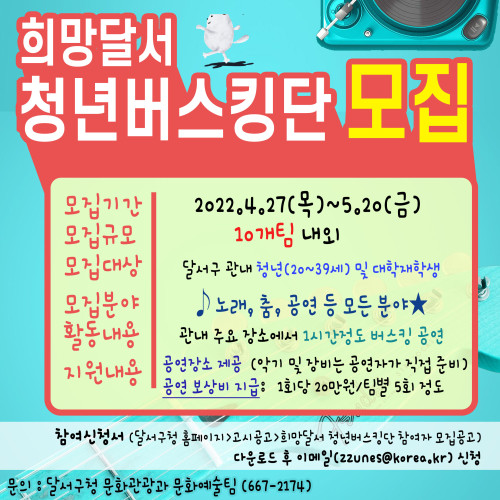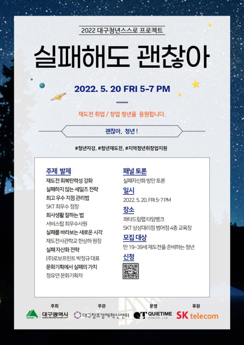 현재 모집 중 검색폼 대구광역시는 해당 페이지를 정보제공을 위한 목적으로 플랫폼을 운영하며, 각 게시글의 내용 및 운영방침에 대한 책임을 지지 않습니다. 대구광역시청년센터 사업 모아보기 전체보기 분야 : 전체 지원사업 채용/인턴/알바 기자단/서포터즈/자원봉사 공모전 교육/강연/토론 축제/공연/전시 커뮤니티활동 기타 정렬 : 전체 신규등록순 모집마감순 상태 : 전체 진행중 종료 기간 설정 검색 검색어 입력 꿀정보등록 누구나 쉽고 빠르게 청년정보를 등록하여 홍보할 수 있습니다. 전체선택 종료 2022년 달서구 청년도전지원사업 월성종합사회복지관 청년도전지원사업본부 ~ 2022.05.20 종료 희망달서 청년버스킹단 모집 달서구청 ~ 2022.05.20 종료 대구청년의 신체건강& 마음건강을 위한 청년사회서비스 참여자 모집 월성종합사회복지관 ~ 2022.05.20 종료 2022 도시재생 청년인턴십 국토교통부 ~ 2022.05.20 종료 달성청년쓰DAY_마음초대권 달성청년쓰 ~ 2022.05.20 종료 2022 괜찮아 청년 포럼 주최: 대구광역시 주관: 대구창조경제혁신센터 ~ 2022.05.19 종료 "누(구도) 구(상하지 못한) 나(눔 아이디어)" 나눔사업 아이디어 공모전 사회복지법인 가정복지회 ~ 2022.05.19 종료 추가모집 / 2022 대구광역시 주민연합형 대학육성사업 공모 공고 협동조합 소이랩 ~ 2022.05.19 631 632 633 634 635 636 637 638 639 640