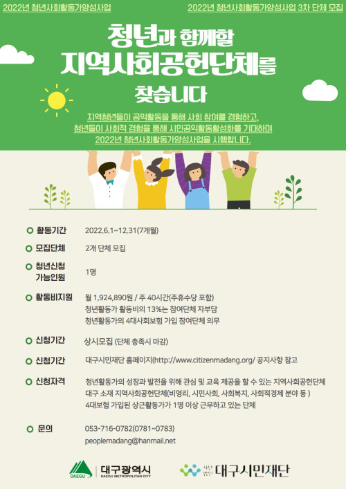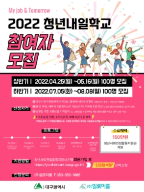 현재 모집 중 검색폼 대구광역시는 해당 페이지를 정보제공을 위한 목적으로 플랫폼을 운영하며, 각 게시글의 내용 및 운영방침에 대한 책임을 지지 않습니다. 대구광역시청년센터 사업 모아보기 전체보기 분야 : 전체 지원사업 채용/인턴/알바 기자단/서포터즈/자원봉사 공모전 교육/강연/토론 축제/공연/전시 커뮤니티활동 기타 정렬 : 전체 신규등록순 모집마감순 상태 : 전체 진행중 종료 기간 설정 검색 검색어 입력 꿀정보등록 누구나 쉽고 빠르게 청년정보를 등록하여 홍보할 수 있습니다. 전체선택 종료 [대구청년 꿈꾸는대로 응원펀딩] 참여자(1기)모집 대구창조경제혁신센터 ~ 2022.05.16 종료 2022 대구 청년 내일학교 상반기 참가자 모집 대구광역시/(주)일로이룸 ~ 2022.05.16 종료 [토담토담] 계절 공동체 (5월 21일 | 내 마음의 적과) 치유농업공동체 토담토담 ~ 2022.05.15 종료 2022년도 환경데이터 활용 아이디어 공모전 환경부 ~ 2022.05.15 종료 [대구시민재단] 2022년 청년사회활동가양성사업 4차 단체 추가모집(~5/15) 대구시민재단 ~ 2022.05.15 종료 [토담토담] 05/22 (일) | 뻣ㅡ뻣이요가 치유농업공동체 토담토담 ~ 2022.05.14 종료 대구색소폰콰르텟 제6회 정기 연주회 주최 · 대구색소폰콰르텟 / 주관 · ARTCUBE ~ 2022.05.14 종료 05/14(토) | 야외 힐링요가 <물~렁이요가> 치유농업공동체 토담토담 ~ 2022.05.13 631 632 633 634 635 636 637 638 639 640