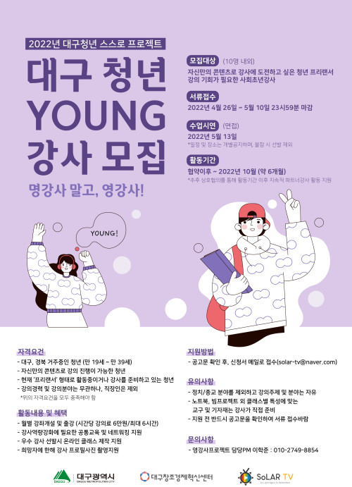 현재 모집 중 검색폼 대구광역시는 해당 페이지를 정보제공을 위한 목적으로 플랫폼을 운영하며, 각 게시글의 내용 및 운영방침에 대한 책임을 지지 않습니다. 대구광역시청년센터 사업 모아보기 전체보기 분야 : 전체 지원사업 채용/인턴/알바 기자단/서포터즈/자원봉사 공모전 교육/강연/토론 축제/공연/전시 커뮤니티활동 기타 정렬 : 전체 신규등록순 모집마감순 상태 : 전체 진행중 종료 기간 설정 검색 검색어 입력 꿀정보등록 누구나 쉽고 빠르게 청년정보를 등록하여 홍보할 수 있습니다. 전체선택 종료 [대화의장] 대화클럽 6기 모집합니다! 레인메이커협동조합 ~ 2022.05.10 종료 대구 청년 YOUNG 강사 모집 솔라티비 ~ 2022.05.10 종료 “그럼에도 우리의 일상은 계속된다” 2022년 나쁜페미니스트와 함께하는 독립영화 상영회! 나쁜페미니스트 ~ 2022.05.10 종료 자아성장 글쓰기 /생각은 뭉게뭉게/ 멤버 모집 아무의 방 ~ 2022.05.09 종료 [과학기술정보통신부] 디지털 청년고민해결단 온라민 진로 멘토링 멘티 모집 한국청년기업가정신재단 ~ 2022.05.09 종료 2022년 외식 창업 인큐베이팅, 청년키움식당 대구앞산점 운영팀 모집 대구광역시 남구청, 계명문화대학교 산학협력단 ~ 2022.05.08 종료 청도군 농장주 육성 프로젝트 농업회사법인 희망토 주식회사 ~ 2022.05.08 종료 2022년 대구광역시 동구 청년도전지원사업 대구 동구청년센터 the꿈 ~ 2022.05.06 631 632 633 634 635 636 637 638 639 640