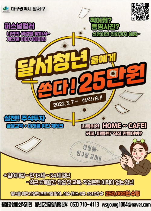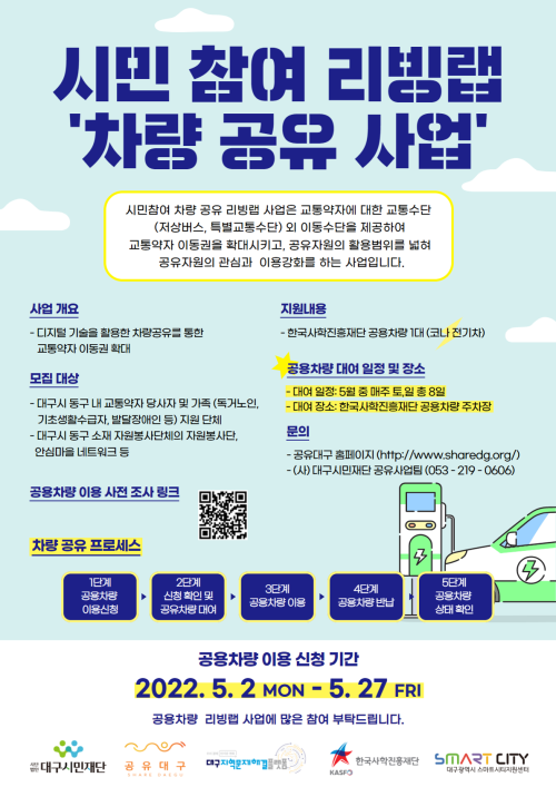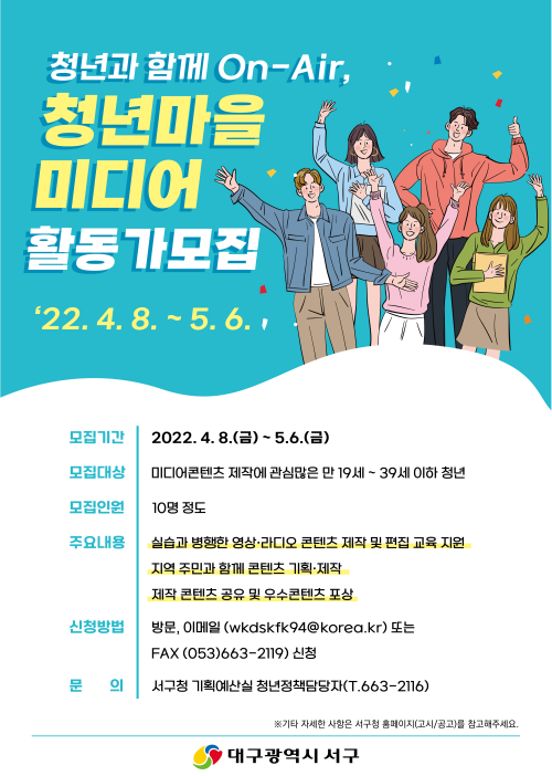 현재 모집 중 검색폼 대구광역시는 해당 페이지를 정보제공을 위한 목적으로 플랫폼을 운영하며, 각 게시글의 내용 및 운영방침에 대한 책임을 지지 않습니다. 대구광역시청년센터 사업 모아보기 전체보기 분야 : 전체 지원사업 채용/인턴/알바 기자단/서포터즈/자원봉사 공모전 교육/강연/토론 축제/공연/전시 커뮤니티활동 기타 정렬 : 전체 신규등록순 모집마감순 상태 : 전체 진행중 종료 기간 설정 검색 검색어 입력 꿀정보등록 누구나 쉽고 빠르게 청년정보를 등록하여 홍보할 수 있습니다. 전체선택 종료 2022년 대구광역시 동구 청년도전지원사업 대구 동구청년센터 the꿈 ~ 2022.05.06 종료 2022년 달서구 청년도전지원사업 월성종합사회복지관 청년도전지원사업본부 ~ 2022.05.06 종료 2022년 달서구 청년도전지원사업 월성종합사회복지관 청년도전지원사업본부 ~ 2022.05.06 종료 시민 참여 리빙랩 ‘차량 공유 사업’ 사전 수요 조사 대구시민재단 공유대구사업팀 ~ 2022.05.06 종료 2022년 [여기잇:다] 정리정돈교육 대구북구가족센터 ~ 2022.05.06 종료 청년과 함께 On-Air~! 청년 마을 미디어 활동가 모집 대구광역시 서구청 ~ 2022.05.06 종료 자아성장 글쓰기 /생각은 뭉게뭉게/ 멤버 모집 문화향유공간 아무의 방 ~ 2022.05.05 종료 2022년 주목해야 할 ICT 트렌드 대구창조경제혁신센터 053창업카페 ~ 2022.05.05 631 632 633 634 635 636 637 638 639 640