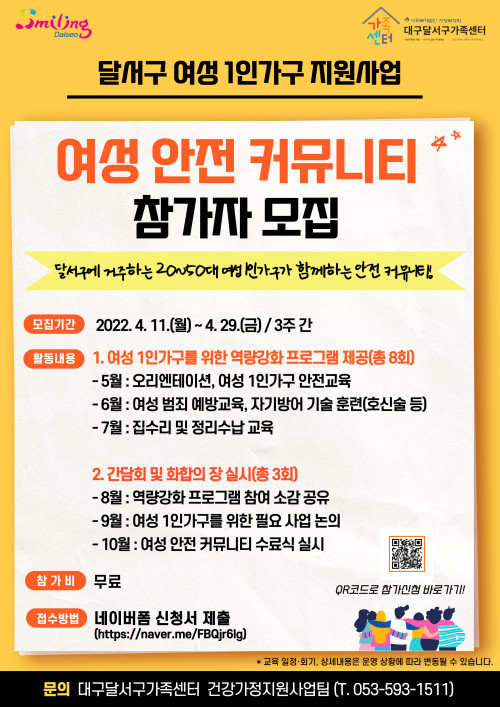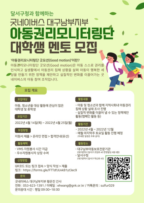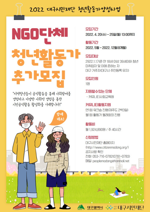 현재 모집 중 검색폼 대구광역시는 해당 페이지를 정보제공을 위한 목적으로 플랫폼을 운영하며, 각 게시글의 내용 및 운영방침에 대한 책임을 지지 않습니다. 대구광역시청년센터 사업 모아보기 전체보기 분야 : 전체 지원사업 채용/인턴/알바 기자단/서포터즈/자원봉사 공모전 교육/강연/토론 축제/공연/전시 커뮤니티활동 기타 정렬 : 전체 신규등록순 모집마감순 상태 : 전체 진행중 종료 기간 설정 검색 검색어 입력 꿀정보등록 누구나 쉽고 빠르게 청년정보를 등록하여 홍보할 수 있습니다. 전체선택 종료 2022년 여성1인가구지원사업 '여성안전커뮤니티' 대구달서구가족센터 ~ 2022.04.29 종료 청년엔터 단편영상 제작지원 공모 대구청년센터 ~ 2022.04.29 대구광역시청년센터 종료 2022 청년도전지원사업 <젊핑> 대구광역시청년센터 ~ 2022.04.29 종료 <지구당> 소박한 수다회 지구당 ~ 2022.04.28 종료 지구당 <도심새탐조단> 책모임 신청 지구당 ~ 2022.04.27 종료 [대구시민재단] 2022년 청년사회활동가양성사업 3차 청년추가모집(~4/26) 대구시민재단 ~ 2022.04.25 종료 굿네이버스 대구남부지부 아동권리모니터링단 굿모션(Good motion) 대학생 멘토 모집 굿네이버스 대구남부지부(대구남부아동보호전문기관) ~ 2022.04.25 종료 1분만에 끝나는 지역문제 제안하기 대구지역문제해결플랫폼 ~ 2022.04.25 641 642 643 644 645 646 647 648 649 650