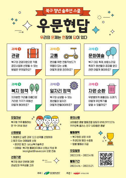 현재 모집 중 검색폼 대구광역시는 해당 페이지를 정보제공을 위한 목적으로 플랫폼을 운영하며, 각 게시글의 내용 및 운영방침에 대한 책임을 지지 않습니다. 대구광역시청년센터 사업 모아보기 전체보기 분야 : 전체 지원사업 채용/인턴/알바 기자단/서포터즈/자원봉사 공모전 교육/강연/토론 축제/공연/전시 커뮤니티활동 기타 정렬 : 전체 신규등록순 모집마감순 상태 : 전체 진행중 종료 기간 설정 검색 검색어 입력 꿀정보등록 누구나 쉽고 빠르게 청년정보를 등록하여 홍보할 수 있습니다. 전체선택 종료 [북구 청년 솔루션스쿨] 우문현답: 우리의 문제는 현장에 답이 있다. 참여자 모집 대구광역시 북구청 ~ 2022.04.10 종료 메이커하우스 리:움 운영자 모집 (주)이엘디지털팹 ~ 2022.04.10 종료 2022 경북지역문제해결플랫폼 온라인 의제제안 경북지역문제해결플랫폼 ~ 2022.04.10 종료 독서모임/책으로 지키는 사이/ 브랜드 멤버 모집 아무의 방 ~ 2022.04.09 종료 2022 달서구 청년들의 취업을 위한 한 걸음(feat. 청년도전지원사업) 월성종합사회복지관 청년도전지원사업본부 ~ 2022.04.08 종료 2022 청년도전지원사업(feat. 달서구) 월성종합사회복지관 청년도전지원사업본부 ~ 2022.04.08 대구광역시청년센터 종료 청년 프리랜서 지원사업 모집 대구광역시청년센터 ~ 2022.04.08 종료 <안녕,낯선사람 Hello, Stranger vol.4: 시각장애인 한혜경×티나> 레인메이커협동조합 ~ 2022.04.07 641 642 643 644 645 646 647 648 649 650