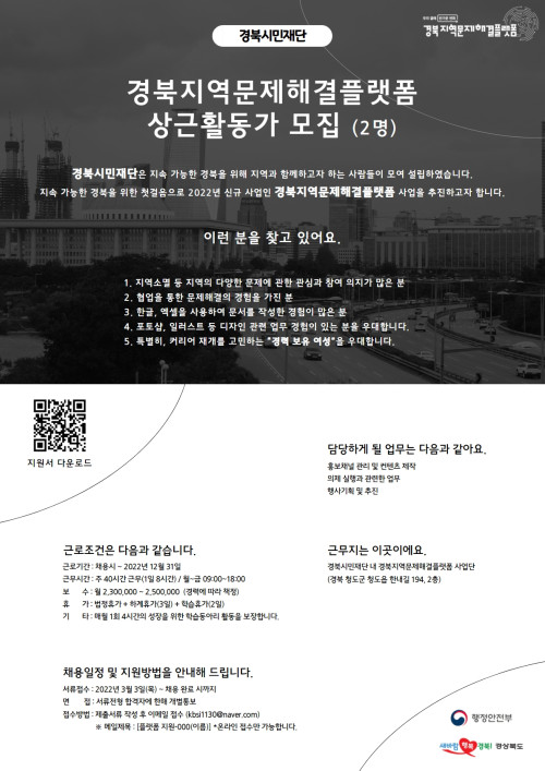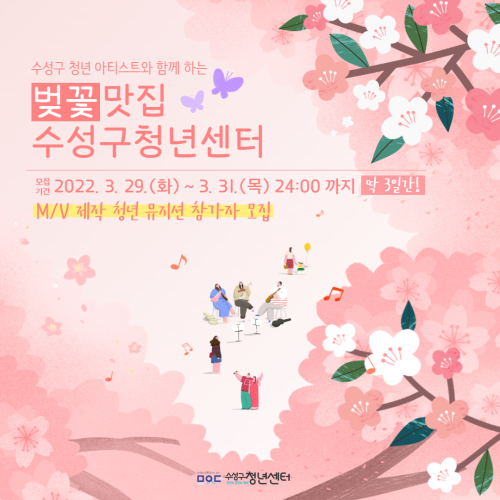 현재 모집 중 검색폼 대구광역시는 해당 페이지를 정보제공을 위한 목적으로 플랫폼을 운영하며, 각 게시글의 내용 및 운영방침에 대한 책임을 지지 않습니다. 대구광역시청년센터 사업 모아보기 전체보기 분야 : 전체 지원사업 채용/인턴/알바 기자단/서포터즈/자원봉사 공모전 교육/강연/토론 축제/공연/전시 커뮤니티활동 기타 정렬 : 전체 신규등록순 모집마감순 상태 : 전체 진행중 종료 기간 설정 검색 검색어 입력 꿀정보등록 누구나 쉽고 빠르게 청년정보를 등록하여 홍보할 수 있습니다. 전체선택 종료 청년도전지원사업본부의 구직 단념 청년을 위한 강의 월성종합사회복지관 청년도전지원사업본부 ~ 2022.04.01 종료 2022 달서구 청년도전지원사업본부의 새로워진 모습 월성종합사회복지관 청년도전지원사업본부 ~ 2022.04.01 종료 M/V 제작 청년 뮤지션 참가자 모집 수성구청년센터 ~ 2022.03.31 종료 대구 전략 게임 모임 <더 게이머즈 Season1 ep2 더 킹덤 : 제국의 몰락> 참가자 모집 (주)시너지어스 ~ 2022.03.31 종료 (사)대구시민재단 공유사업팀 직원 채용 공고 대구시민재단 공유대구사업팀 ~ 2022.03.31 종료 2022년 달서구가족센터 1인가구 동아리 참여자 모집 대구달서구가족센터 ~ 2022.03.31 종료 경북지역문제해결플랫폼 상근활동가 모집 경북시민재단 ~ 2022.03.31 종료 [취향의 숲] 3월 프로그램 안내 취향의 숲 ~ 2022.03.31 651 652 653 654 655 656 657 658 659 660