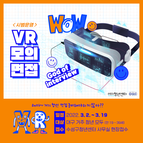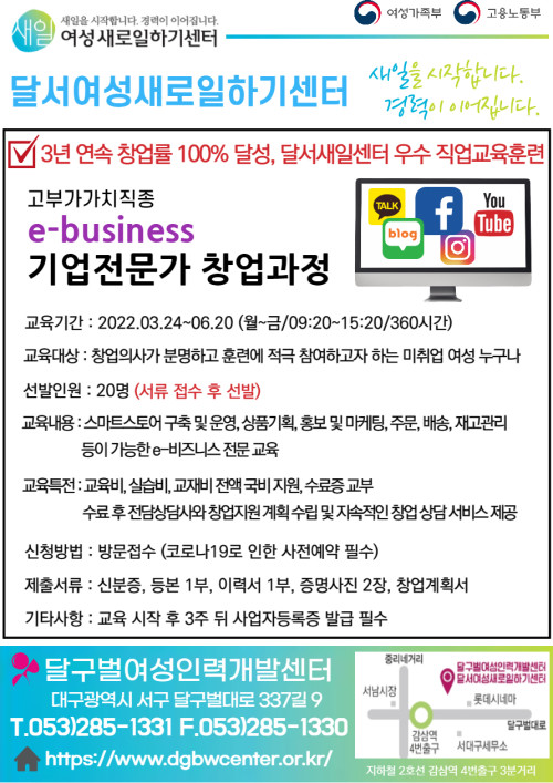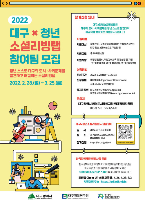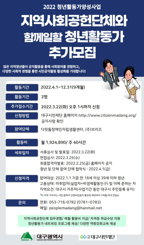 현재 모집 중 검색폼 대구광역시는 해당 페이지를 정보제공을 위한 목적으로 플랫폼을 운영하며, 각 게시글의 내용 및 운영방침에 대한 책임을 지지 않습니다. 대구광역시청년센터 사업 모아보기 전체보기 분야 : 전체 지원사업 채용/인턴/알바 기자단/서포터즈/자원봉사 공모전 교육/강연/토론 축제/공연/전시 커뮤니티활동 기타 정렬 : 전체 신규등록순 모집마감순 상태 : 전체 진행중 종료 기간 설정 검색 검색어 입력 꿀정보등록 누구나 쉽고 빠르게 청년정보를 등록하여 홍보할 수 있습니다. 전체선택 종료 독서문화 프로젝트 지원공모 한국출판문화산업진흥원 ~ 2022.03.25 종료 2022 대구x청년 소셜리빙랩 대구경북연구원(창의도시재생지원센터) ~ 2022.03.25 종료 e-buiness 기업전문가 창업과정 달구벌여성인력개발센터 ~ 2022.03.24 종료 2022년 청년사회활동가양성사업 3차 청년 추가모집(~03/22) 대구시민재단 ~ 2022.03.22 종료 새학기 원데이 클래스 참여자 모집 솔라콘텐츠그룹 ~ 2022.03.19 종료 수성구청년센터 VR 모의면접 시범 운영 수성구청년센터 ~ 2022.03.19 종료 2022년 청년동아리 신청하고 활동비 50만원 지원받자! 대구광역시 북구 ~ 2022.03.18 대구광역시청년센터 종료 2022 대구광역시 청년센터 청년기자단 6기 모집공고 대구광역시 청년센터 ~ 2022.03.18 651 652 653 654 655 656 657 658 659 660
