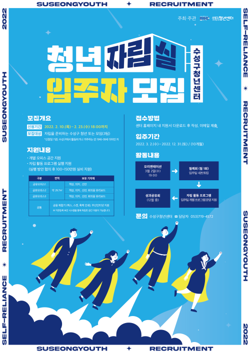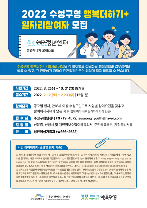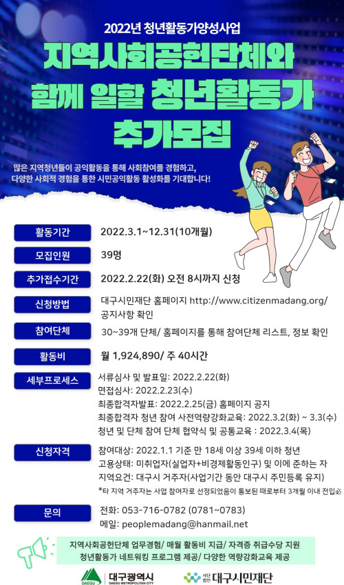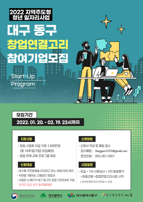 현재 모집 중 검색폼 대구광역시는 해당 페이지를 정보제공을 위한 목적으로 플랫폼을 운영하며, 각 게시글의 내용 및 운영방침에 대한 책임을 지지 않습니다. 대구광역시청년센터 사업 모아보기 전체보기 분야 : 전체 지원사업 채용/인턴/알바 기자단/서포터즈/자원봉사 공모전 교육/강연/토론 축제/공연/전시 커뮤니티활동 기타 정렬 : 전체 신규등록순 모집마감순 상태 : 전체 진행중 종료 기간 설정 검색 검색어 입력 꿀정보등록 누구나 쉽고 빠르게 청년정보를 등록하여 홍보할 수 있습니다. 전체선택 종료 대구광역시-한국MS 협력 프로젝트 「2022년 대구 AI 스쿨 사업」 참여자 모집 대구테크노파크 ~ 2022.02.25 종료 [대구 교육/네트워크] 소이랩 디자인씽킹 퍼실리테이터 양성교육 수강자 모집 협동조합소이랩 ~ 2022.02.24 종료 청년 디지털 선도인재 양성교육 참여생 모집 빛글협동조합 ~ 2022.02.23 종료 [수성구민 해당]운영매니저 모집 수성구청년센터 ~ 2022.02.23 종료 수성구청년센터 <청년자립실>입주자 모집 수성구청년센터 ~ 2022.02.23 종료 [대구시민재단] 2022년 청년사회활동가양성사업 추가모집 (~02/22) 대구시민재단 ~ 2022.02.22 종료 대구 동구 창업연결고리 사업 대구동구청년센터 the꿈 ~ 2022.02.19 종료 AI엔지니어링 온라인 입시설명회 개최 안내 한국폴리텍대학 대구캠퍼스 ~ 2022.02.18 651 652 653 654 655 656 657 658 659 660