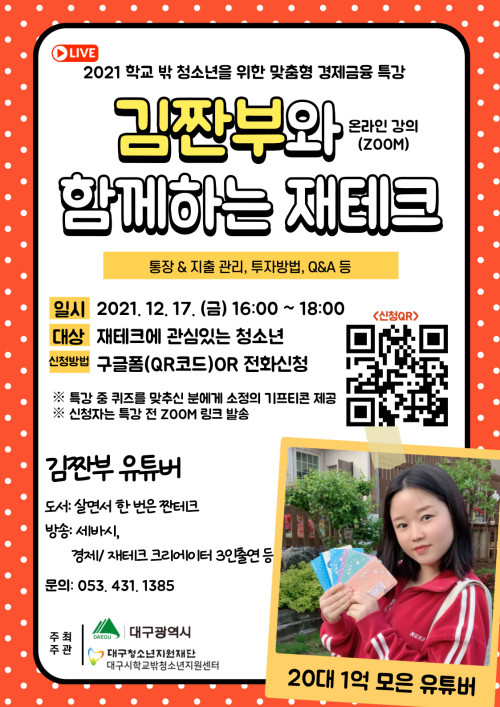 현재 모집 중 검색폼 대구광역시는 해당 페이지를 정보제공을 위한 목적으로 플랫폼을 운영하며, 각 게시글의 내용 및 운영방침에 대한 책임을 지지 않습니다. 대구광역시청년센터 사업 모아보기 전체보기 분야 : 전체 지원사업 채용/인턴/알바 기자단/서포터즈/자원봉사 공모전 교육/강연/토론 축제/공연/전시 커뮤니티활동 기타 정렬 : 전체 신규등록순 모집마감순 상태 : 전체 진행중 종료 기간 설정 검색 검색어 입력 꿀정보등록 누구나 쉽고 빠르게 청년정보를 등록하여 홍보할 수 있습니다. 전체선택 대구광역시청년센터 종료 2021 <청년상담소> 12월 일반형상담 참여자 모집 대구광역시청년센터 ~ 2021.12.23 대구광역시청년센터 종료 [대구광역시청년센터 채용공고] 2022년을 함께할 인재를 찾습니다 대구광역시청년센터 ~ 2021.12.19 종료 온라인(ZOOM) 경제금융 유튜버 '김짠부' 특강 개최 대구광역시 학교 밖 청소년지원센터 ~ 2021.12.17 대구광역시청년센터 종료 젊프 신규회원가입 외식쿠폰 이벤트(마감) 대구광역시 청년센터 ~ 2021.12.17 대구광역시청년센터 종료 다온나그래 연말 프로그램 <다와서 메리메리> 이벤트 참여자 모집 대구광역시청년센터 ~ 2021.12.14 종료 대구창조경제혁신센터 053창업카페 투자 네트워크 프로그램 053창업카페, 대구창조경제혁신센터 ~ 2021.12.14 종료 대구로 ESG 시민참여 아이디어 공모전 대구지역문제해결플랫폼 ~ 2021.12.12 종료 [대구RE100시민클럽 2차 가입이벤트] 대구RE100시민클럽 ~ 2021.12.12 661 662 663 664 665 666 667 668 669 670