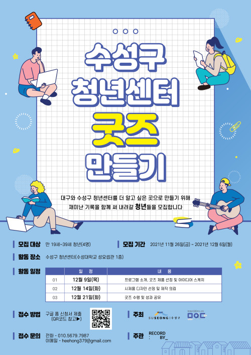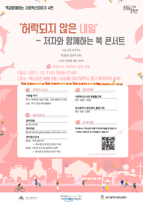 현재 모집 중 검색폼 대구광역시는 해당 페이지를 정보제공을 위한 목적으로 플랫폼을 운영하며, 각 게시글의 내용 및 운영방침에 대한 책임을 지지 않습니다. 대구광역시청년센터 사업 모아보기 전체보기 분야 : 전체 지원사업 채용/인턴/알바 기자단/서포터즈/자원봉사 공모전 교육/강연/토론 축제/공연/전시 커뮤니티활동 기타 정렬 : 전체 신규등록순 모집마감순 상태 : 전체 진행중 종료 기간 설정 검색 검색어 입력 꿀정보등록 누구나 쉽고 빠르게 청년정보를 등록하여 홍보할 수 있습니다. 전체선택 종료 수성구청년센터 굿즈 만들기 수성구청년센터, 레코드바이 ~ 2021.12.06 종료 숲멍불멍 힐링캠프 참가자 모집 수성구청년센터 ~ 2021.12.05 종료 [대구시민재단/공유사업팀] 2021 최종공유회 신청안내 대구시민재단 공유대구사업팀 ~ 2021.12.05 종료 칠성시장역 1번출구 중식당 총괄운영자 채용공고 칠성종합시장 ~ 2021.12.05 종료 함께 느끼는 2030&대구 국회의원조정훈, 국회미래연구원, 대구청년활동가네트워크 ~ 2021.12.03 종료 제73주년 세계 인권선언의 날 기념 「명사 초청 인권 특강」 개최 대구광역시 자치행정과 ~ 2021.12.03 종료 [과학기술정보통신부]2021 클라우드 교육생 모집(~12/2) 과학기술정보통신부, 한국클라우드산업협회, 한국표준협회 ~ 2021.12.02 종료 '허락되지 않은 내일' 저자와 함께하는 북 콘서트_분홍돌고래문학관_책과함께하는 사회혁신이야기 사회혁신도서관 분홍돌고래, 대구광역시 시민공익활동지원센터, 대구광역시 청년센터 ~ 2021.12.01 661 662 663 664 665 666 667 668 669 670
