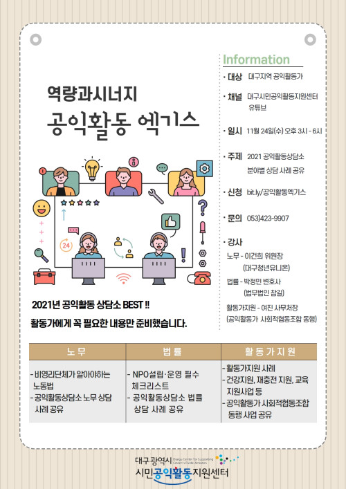 현재 모집 중 검색폼 대구광역시는 해당 페이지를 정보제공을 위한 목적으로 플랫폼을 운영하며, 각 게시글의 내용 및 운영방침에 대한 책임을 지지 않습니다. 대구광역시청년센터 사업 모아보기 전체보기 분야 : 전체 지원사업 채용/인턴/알바 기자단/서포터즈/자원봉사 공모전 교육/강연/토론 축제/공연/전시 커뮤니티활동 기타 정렬 : 전체 신규등록순 모집마감순 상태 : 전체 진행중 종료 기간 설정 검색 검색어 입력 꿀정보등록 누구나 쉽고 빠르게 청년정보를 등록하여 홍보할 수 있습니다. 전체선택 종료 2021 [수성새일] 국비무료 직업훈련 교육생 모집 안내 수성여성새로일하기센터 ~ 2021.11.30 종료 전국 청년대상 비대면 집단상담 <마음 돌아보기 5기> 참여자 모집 지역사회심리건강지원그룹 모두 ~ 2021.11.29 종료 대구예술발전소 북 페스티벌 <북적북적> 대구예술발전소 ~ 2021.11.28 종료 대구경북지역 대학생 대상 글로벌 기업 현직자 특강 경북대학교 ~ 2021.11.26 종료 수성구청년센터 청년힐링 프로그램(11월) 수성구청년센터 ~ 2021.11.26 종료 [대구시민공익활동지원센터] 2021년 역량강화 지원사업_공익활동 엑기스 참가신청 대구광역시 시민공익활동지원센터 ~ 2021.11.24 대구광역시청년센터 종료 [개미는 뚠뚠 내통장 뚱뚱] 시즌3 대구광역시청년센터 ~ 2021.11.23 종료 <경로를 재탐색합니다> 온라인 공유회 내마음은 콩밭 협동조합 ~ 2021.11.23 671 672 673 674 675 676 677 678 679 680