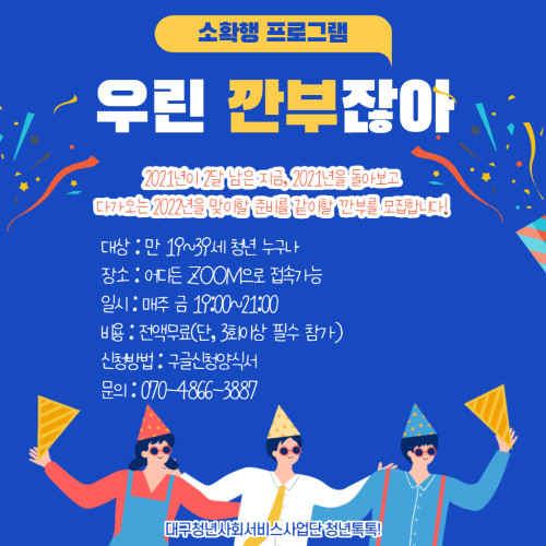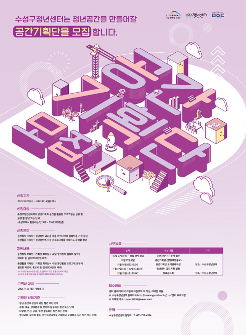 현재 모집 중 검색폼 대구광역시는 해당 페이지를 정보제공을 위한 목적으로 플랫폼을 운영하며, 각 게시글의 내용 및 운영방침에 대한 책임을 지지 않습니다. 대구광역시청년센터 사업 모아보기 전체보기 분야 : 전체 지원사업 채용/인턴/알바 기자단/서포터즈/자원봉사 공모전 교육/강연/토론 축제/공연/전시 커뮤니티활동 기타 정렬 : 전체 신규등록순 모집마감순 상태 : 전체 진행중 종료 기간 설정 검색 검색어 입력 꿀정보등록 누구나 쉽고 빠르게 청년정보를 등록하여 홍보할 수 있습니다. 전체선택 종료 2021 청년-지역주민 역량강화프로그램<꽃피는 상인동> 대구지역문제해결플랫폼 ~ 2021.11.19 종료 [돈스파이크가 음악하다가 고기에 미쳐버린썰 풀음] 스타 CEO와 함께하는 LIVE TALK 소상공인진흥공단 ~ 2021.11.17 종료 [📢대구창경 임팩트스케일업] 대구 소셜벤처 10팀의 최종성장공유회에 초대합니다! (11/17) 엠와이소셜컴퍼니, 대구창조경제혁신센터 ~ 2021.11.17 종료 "나의 진짜 MBTI는?" [ MBTI 지피지기 집단상담] 참여자 모집 월성종합사회복지관 ~ 2021.11.17 대구광역시청년센터 종료 2021 청년상담소 진로토크 시즌3 참여자 모집 대구광역시청년센터 ~ 2021.11.17 종료 2021 AI 인공지능 온라인 교육으로 자격증까지 빠샤!😎 한국표준협회 ~ 2021.11.17 종료 2021 청년톡톡 소확행프로그램 참여자 모집 [마감] 대구청년사회서비스사업단 청년톡톡 ~ 2021.11.16 종료 수성구청년센터 ‘공간기획단’ 모집 수성구청년센터 ~ 2021.11.14 671 672 673 674 675 676 677 678 679 680