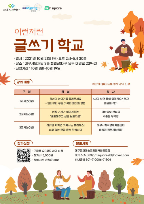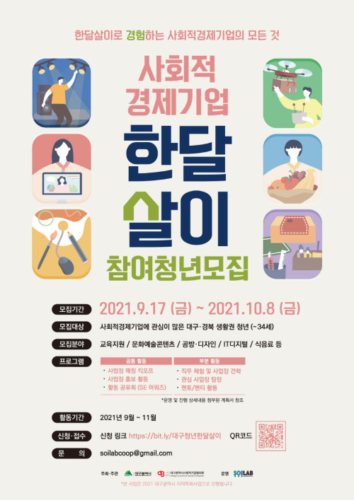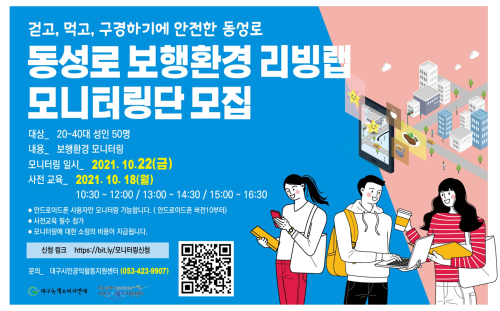 현재 모집 중 검색폼 대구광역시는 해당 페이지를 정보제공을 위한 목적으로 플랫폼을 운영하며, 각 게시글의 내용 및 운영방침에 대한 책임을 지지 않습니다. 대구광역시청년센터 사업 모아보기 전체보기 분야 : 전체 지원사업 채용/인턴/알바 기자단/서포터즈/자원봉사 공모전 교육/강연/토론 축제/공연/전시 커뮤니티활동 기타 정렬 : 전체 신규등록순 모집마감순 상태 : 전체 진행중 종료 기간 설정 검색 검색어 입력 꿀정보등록 누구나 쉽고 빠르게 청년정보를 등록하여 홍보할 수 있습니다. 전체선택 종료 이런저런 글쓰기 학교 대구지역문제해결플랫폼, 대구문화예술프리랜서협동조합 ~ 2021.10.19 대구광역시청년센터 종료 2021 사회진입활동지원금(30만원) 상담연결형 청년상담소 참여자 모집 대구광역시청년센터 ~ 2021.10.19 종료 사회적경제기업 한달살이(추가모집) 대구광역시/대구광역시사회적기업협의회 ~ 2021.10.17 종료 동성로 보행환경 모니터링단 모집 대구시민공익활동지원센터 ~ 2021.10.17 종료 2021 대구광역시 양성평등 문화확산 콘텐츠 공모전 대구광역시 / 대구여성가족재단 ~ 2021.10.17 종료 <다 함께 살기위한 동물권TALK> 온라인 숙의토론 더컴퍼니씨 ~ 2021.10.15 종료 청년들끼리 모여, 으쌰으쌰! 대구 중구 북성로 도시재생현장지원센터 ~ 2021.10.15 종료 2021 대구 창조경제혁신센터 청년귀환 프로젝트 창업편 '대구 창업 원정대' 참가자 모집 대구창조경제혁신센터 ~ 2021.10.15 681 682 683 684 685 686 687 688 689 690