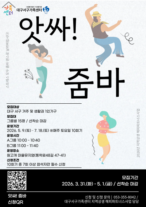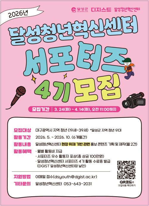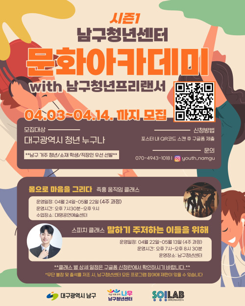 현재 모집 중 검색폼 대구광역시는 해당 페이지를 정보제공을 위한 목적으로 플랫폼을 운영하며, 각 게시글의 내용 및 운영방침에 대한 책임을 지지 않습니다. 대구광역시청년센터 사업 모아보기 전체보기 분야 : 전체 지원사업 채용/인턴/알바 기자단/서포터즈/자원봉사 공모전 교육/강연/토론 축제/공연/전시 커뮤니티활동 기타 정렬 : 전체 신규등록순 모집마감순 상태 : 전체 진행중 종료 기간 설정 검색 검색어 입력 꿀정보등록 누구나 쉽고 빠르게 청년정보를 등록하여 홍보할 수 있습니다. 전체선택 진행중 [국비지원교육] ERP 실무 완벽 정복 + 전산회계1급·전산세무2급 동시 취득 과정 영진직업전문학교 ~ 2026.04.13 진행중 대구시 가족돌봄 청년 , 위기청년을 지원합니다 월성종합사회복지관 ~ 2026.04.13 진행중 남구청년센터 2026 문화아카데미 시즌1 프로그램 참여자 모집 남구청년센터 ~ 2026.04.14 진행중 [대구서구가족센터]2026년 해피파트너스사업 참여자 모집 대구서구가족센터 ~ 2026.04.14 진행중 [문화체육관광부] 문화요일 영상 공모전 (~4/14) 지역문화진흥원 ~ 2026.04.14 진행중 [ICT콤플렉스][지역 우수기업 X 개발자 네트워킹] #1. 지역 기업 모집 ICT콤플렉스 ~ 2026.04.14 진행중 [정규과정] 아크릴 캔버스화 대구중구생활문화센터 ~ 2026.04.14 진행중 2026년 달성청년혁신센터 서포터즈 4기 달성청년혁신센터 ~ 2026.04.14 1 2 3 4 5 6 7 8 9 10
