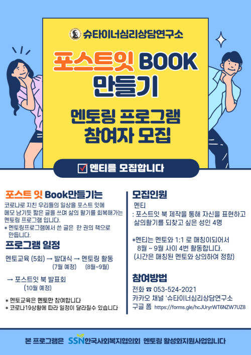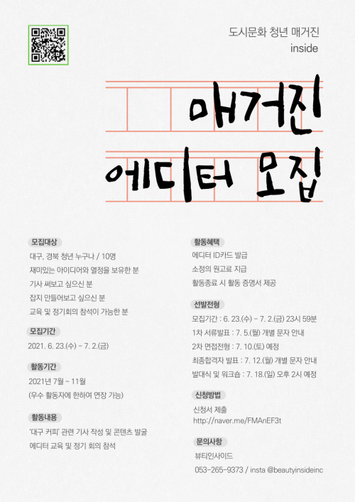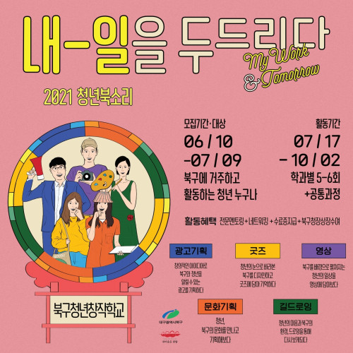 현재 모집 중 검색폼 대구광역시는 해당 페이지를 정보제공을 위한 목적으로 플랫폼을 운영하며, 각 게시글의 내용 및 운영방침에 대한 책임을 지지 않습니다. 대구광역시청년센터 사업 모아보기 전체보기 분야 : 전체 지원사업 채용/인턴/알바 기자단/서포터즈/자원봉사 공모전 교육/강연/토론 축제/공연/전시 커뮤니티활동 기타 정렬 : 전체 신규등록순 모집마감순 상태 : 전체 진행중 종료 기간 설정 검색 검색어 입력 꿀정보등록 누구나 쉽고 빠르게 청년정보를 등록하여 홍보할 수 있습니다. 전체선택 종료 2021 [북구 청년 창작 학교] 청년 북소리: 내-일을 두드리다! 참여자 모집 대구광역시 북구청 ~ 2021.07.09 대구광역시청년센터 종료 2021 청년상담소 진로토크 시즌2 4회차 참여자 모집 대구광역시청년센터 ~ 2021.07.06 종료 2021 문학을 통한 글쓰기 : 혼자 그리고 같이 <참여자 모집> 남구 새로움센터 ~ 2021.07.04 종료 2021 [멘토링참여자 모집] 포스트잇북 만들기 프로그램 슈타이너심리상담연구소 ~ 2021.07.02 종료 2021 도시문화 청년 매거진 에디터 모집 (주)뷰티인사이드 ~ 2021.07.02 종료 2021 권헌익 모두읽기 장샤론 / 스몰토크 ~ 2021.07.01 종료 2021 미취업 청년참여자 모집 청년베이스캠프 ~ 2021.06.30 종료 2021 10만명이 보는, 함께 참여하고 만드는 미디어유스 기자회원 모집 미디어유스 ~ 2021.06.30 701 702 703 704 705 706 707 708 709 710