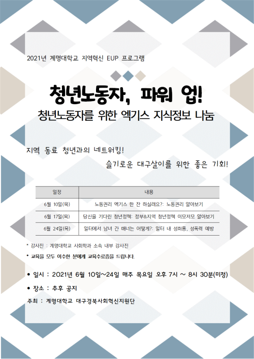 현재 모집 중 검색폼 대구광역시는 해당 페이지를 정보제공을 위한 목적으로 플랫폼을 운영하며, 각 게시글의 내용 및 운영방침에 대한 책임을 지지 않습니다. 대구광역시청년센터 사업 모아보기 전체보기 분야 : 전체 지원사업 채용/인턴/알바 기자단/서포터즈/자원봉사 공모전 교육/강연/토론 축제/공연/전시 커뮤니티활동 기타 정렬 : 전체 신규등록순 모집마감순 상태 : 전체 진행중 종료 기간 설정 검색 검색어 입력 꿀정보등록 누구나 쉽고 빠르게 청년정보를 등록하여 홍보할 수 있습니다. 전체선택 종료 2021 [IT 일자리] 디지털 전환 지원사업 전문강사를 모집합니다 한국표준협회 ~ 2021.06.14 종료 2021 하반기 창의공간,온 공간지킴이 모집 대구 창의도시재생지원센터 ~ 2021.06.14 종료 2021 대구청년정책네트워크 일자리분과 설문 대구청년정책네트워크 일자리분과 ~ 2021.06.13 대구광역시청년센터 종료 2021하반기 청년활력공간 다온나그래 공간운영단 모집 대구광역시청년센터 ~ 2021.06.13 종료 2021 사회적기업가 육성사업 예비 창업팀 모집 한국사회적기업진흥원 ~ 2021.06.11 종료 2021 대구창조경제혁신센터 채용설명회 개최 (재)대구창조경제혁신센터 ~ 2021.06.10 종료 2021 온택트 주니어해양피켓챌린지 뉴스1 ~ 2021.06.10 종료 2021 청년노동자를 위한 엑기스 지식정보 나눔 계명대학교 ~ 2021.06.09 701 702 703 704 705 706 707 708 709 710