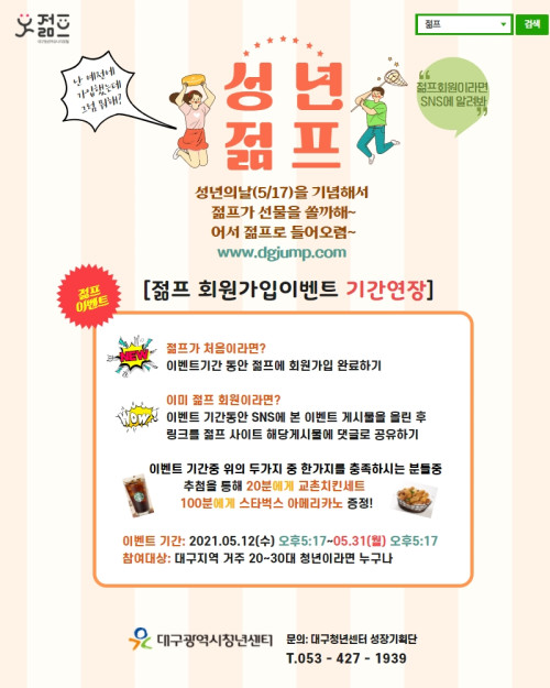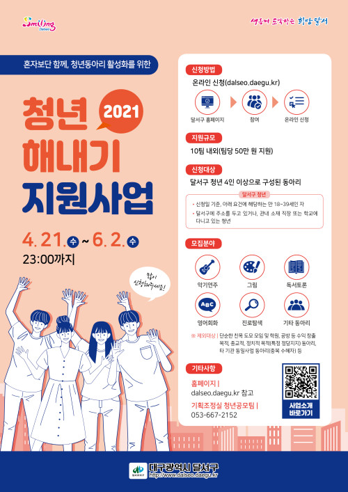 현재 모집 중 검색폼 대구광역시는 해당 페이지를 정보제공을 위한 목적으로 플랫폼을 운영하며, 각 게시글의 내용 및 운영방침에 대한 책임을 지지 않습니다. 대구광역시청년센터 사업 모아보기 전체보기 분야 : 전체 지원사업 채용/인턴/알바 기자단/서포터즈/자원봉사 공모전 교육/강연/토론 축제/공연/전시 커뮤니티활동 기타 정렬 : 전체 신규등록순 모집마감순 상태 : 전체 진행중 종료 기간 설정 검색 검색어 입력 꿀정보등록 누구나 쉽고 빠르게 청년정보를 등록하여 홍보할 수 있습니다. 전체선택 종료 2021 청년 해내기 지원사업 참여자 모집 달서구청 ~ 2021.06.02 종료 2021 goBlock실무 프로젝트 A반 [과기정통부 혁신성장청년인재] 한국IT교육원 ~ 2021.05.31 종료 2021 청년톡톡) 2030 청년은 누구나 무료! 대구청년사회서비스사업단 ~ 2021.05.31 종료 2021 외식 성공창업 푸드밸리 협동조합 ~ 2021.05.31 종료 2021 농촌에서 살아보기 청년 프로젝트 로컬리스트 상주다움 ~ 2021.05.31 종료 2021 [50%할인] 3D프린터 테라리움 메이커하우스 리움 ~ 2021.05.31 종료 2021 콘텐츠 융합팩토리 참가자 모집 [경북콘텐츠코리아랩] 경상북도콘텐츠진흥원 ~ 2021.05.31 종료 2021 '성년의 날(5/17)' 기념 젊프이벤트[기간연장] 대구청년센터 ~ 2021.05.31 711 712 713 714 715 716 717 718 719 720