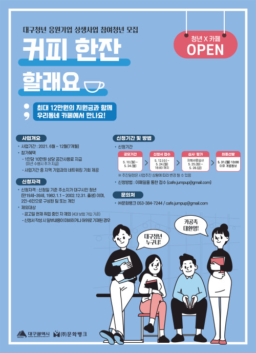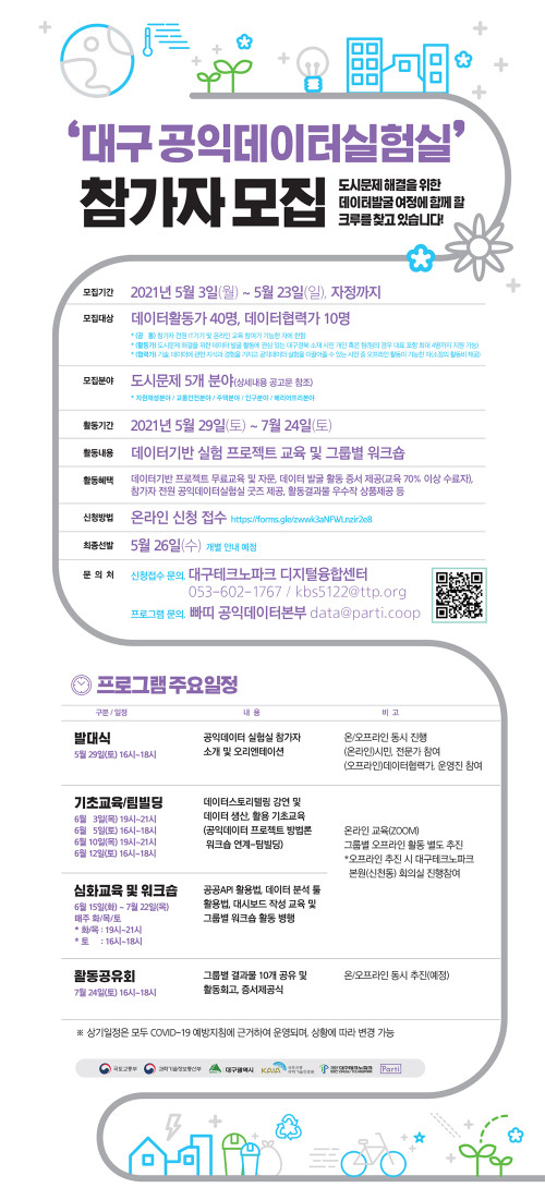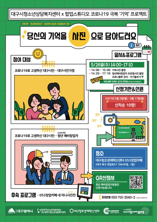 현재 모집 중 검색폼 대구광역시는 해당 페이지를 정보제공을 위한 목적으로 플랫폼을 운영하며, 각 게시글의 내용 및 운영방침에 대한 책임을 지지 않습니다. 대구광역시청년센터 사업 모아보기 전체보기 분야 : 전체 지원사업 채용/인턴/알바 기자단/서포터즈/자원봉사 공모전 교육/강연/토론 축제/공연/전시 커뮤니티활동 기타 정렬 : 전체 신규등록순 모집마감순 상태 : 전체 진행중 종료 기간 설정 검색 검색어 입력 꿀정보등록 누구나 쉽고 빠르게 청년정보를 등록하여 홍보할 수 있습니다. 전체선택 종료 2021 K-Move스쿨 말레이시아 해외취업 연수 참여자 모집 달서구청 일자리지원과 ~ 2021.05.25 종료 2021 대구청년응원기업상생사업 참여청년모집 대구광역시/(주)문화뱅크 ~ 2021.05.24 종료 2021 명품대구경북 박람회 대구광역시, 매일신문 ~ 2021.05.23 종료 2021 공익데이터실험실 참가자 모집 [대구TP] 대구테크노파크 ~ 2021.05.23 종료 2021 [우린 이렇게 왔다] 대표저자들과의 만남 #4 Nexon America-Joon Lee (주)타임리 ~ 2021.05.22 종료 2021 대구광역시 장애인 온라인 취업박람회 대구광역시 ~ 2021.05.21 종료 2021 팝업공유 스튜디오 '당신의 기억을 사진으로 담아드려요' 더컴퍼니씨협동조합 ~ 2021.05.20 종료 2021 북미대학 진학 성공전략 #3 뉴욕대 강근실 (주)타임리 ~ 2021.05.20 711 712 713 714 715 716 717 718 719 720