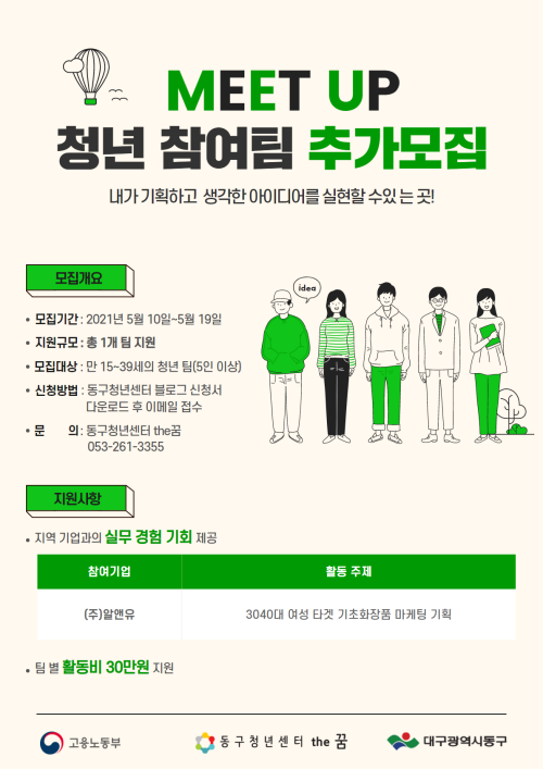 현재 모집 중 검색폼 대구광역시는 해당 페이지를 정보제공을 위한 목적으로 플랫폼을 운영하며, 각 게시글의 내용 및 운영방침에 대한 책임을 지지 않습니다. 대구광역시청년센터 사업 모아보기 전체보기 분야 : 전체 지원사업 채용/인턴/알바 기자단/서포터즈/자원봉사 공모전 교육/강연/토론 축제/공연/전시 커뮤니티활동 기타 정렬 : 전체 신규등록순 모집마감순 상태 : 전체 진행중 종료 기간 설정 검색 검색어 입력 꿀정보등록 누구나 쉽고 빠르게 청년정보를 등록하여 홍보할 수 있습니다. 전체선택 종료 2021 Kakao 클래스 - 톡스토어 판매자 양성과정 모집공고 (재)대구창조경제혁신센터 ~ 2021.05.20 대구광역시청년센터 종료 2021 대구광역시청년센터 인재채용 대구광역시청년센터 ~ 2021.05.20 종료 2021 목돈마련 프로젝트!! 자산형성지원사업 대구광역시 복지정책과 ~ 2021.05.20 종료 2021 청년실무경험 지원 'MEET UP' 추가모집 동구청년센터 the꿈 ~ 2021.05.19 종료 2021 대구 독립운동 발자취를 따라 떠나는 시간여행자_서포터즈 모집 메세지팩토리 ~ 2021.05.19 종료 2021_1인미디어콘텐츠 제작 전문인력 양성과정 교육생 모집 수성여성새로일하기센터 ~ 2021.05.18 종료 2021 대구 장애공감주간 공감특강 대구광역시 ~ 2021.05.18 종료 2021 성년의 날 기념 「청년토크 Y」 청년재단 ~ 2021.05.17 711 712 713 714 715 716 717 718 719 720
