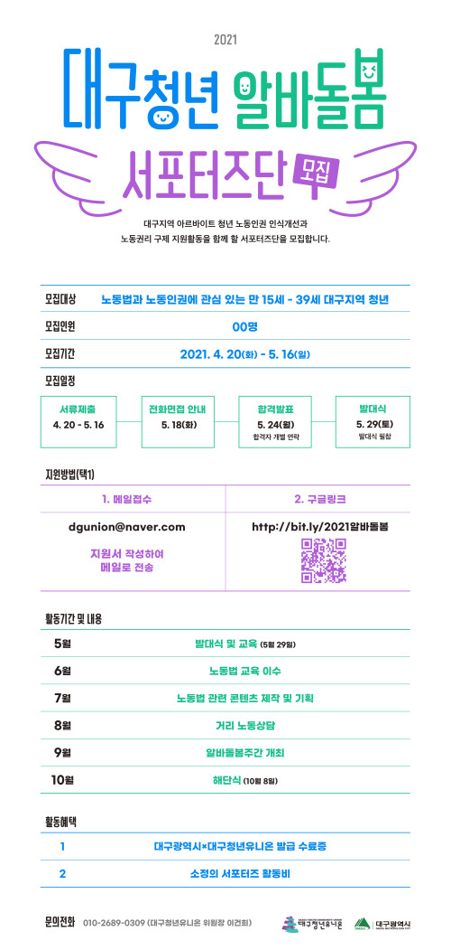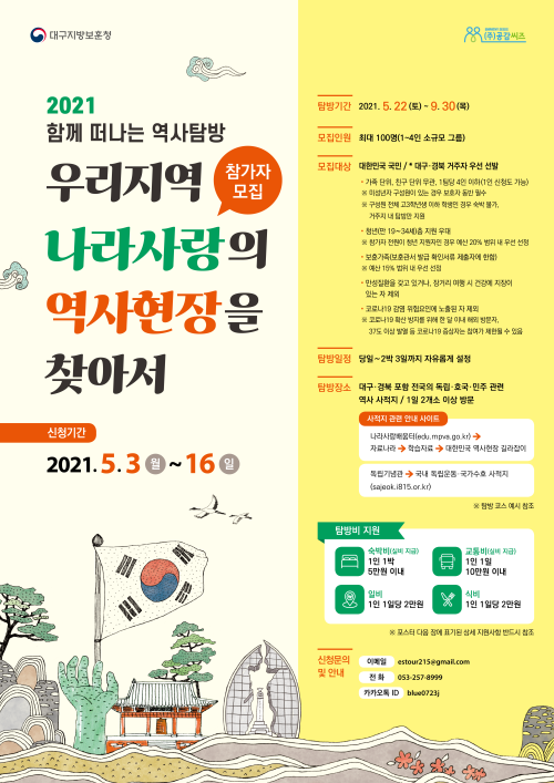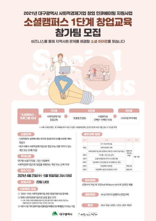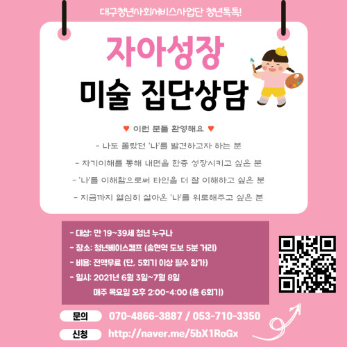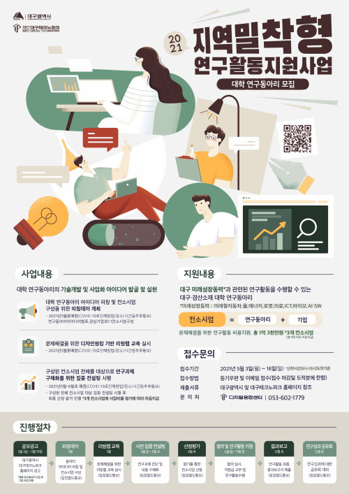 현재 모집 중 검색폼 대구광역시는 해당 페이지를 정보제공을 위한 목적으로 플랫폼을 운영하며, 각 게시글의 내용 및 운영방침에 대한 책임을 지지 않습니다. 대구광역시청년센터 사업 모아보기 전체보기 분야 : 전체 지원사업 채용/인턴/알바 기자단/서포터즈/자원봉사 공모전 교육/강연/토론 축제/공연/전시 커뮤니티활동 기타 정렬 : 전체 신규등록순 모집마감순 상태 : 전체 진행중 종료 기간 설정 검색 검색어 입력 꿀정보등록 누구나 쉽고 빠르게 청년정보를 등록하여 홍보할 수 있습니다. 전체선택 종료 2021 청년톡톡) 미술집단상담 무료 이용자 모집 대구청년사회서비스사업단 ~ 2021.05.17 종료 2021 글로벌 전자상거래 전문가 양성과정 교육생 모집 수성여성새로일하기센터 ~ 2021.05.17 종료 2021 [대구지방보훈청] 함께 떠나는 역사탐방 '우리지역 나라사랑의 역사현장을 찾아서' 참가 희망자 모집 ! (주)공감씨즈 ~ 2021.05.16 종료 2021 한국생산성본부 혁신성장 청년인재 집중양성 [클라우드] 교육생 모집 한국생산성본부 ~ 2021.05.16 종료 2021 대구시 사회적경제기업 창업 인큐베이팅 지원사업 '1단계 창업교육' 참가팀 모집(~5/16) (사)커뮤니티와경제 ~ 2021.05.16 종료 2021년 대구청년 알바돌봄 서포터즈단 모집 대구청년유니온 ~ 2021.05.16 종료 2021_SW핵심인재 채용연계 과정 “ 무료로 교육 듣고 핵심인재로 취업하자! ” DIP아카데미 ~ 2021.05.16 종료 2021 지역밀착형 연구활동 지원사업 대학 연구동아리 모집 공고 (추가모집) 대구테크노파크 디지털융합센터 ~ 2021.05.16 711 712 713 714 715 716 717 718 719 720