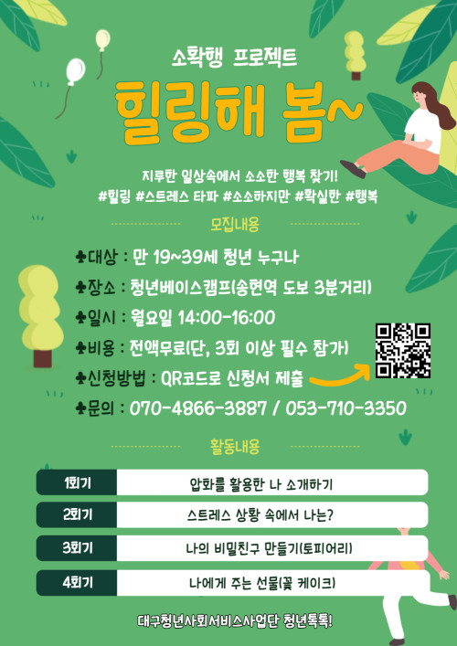 현재 모집 중 검색폼 대구광역시는 해당 페이지를 정보제공을 위한 목적으로 플랫폼을 운영하며, 각 게시글의 내용 및 운영방침에 대한 책임을 지지 않습니다. 대구광역시청년센터 사업 모아보기 전체보기 분야 : 전체 지원사업 채용/인턴/알바 기자단/서포터즈/자원봉사 공모전 교육/강연/토론 축제/공연/전시 커뮤니티활동 기타 정렬 : 전체 신규등록순 모집마감순 상태 : 전체 진행중 종료 기간 설정 검색 검색어 입력 꿀정보등록 누구나 쉽고 빠르게 청년정보를 등록하여 홍보할 수 있습니다. 전체선택 대구광역시청년센터 종료 2021 청년상담소 진로토크 참여자 모집 대구광역시청년센터 ~ 2021.05.11 종료 2021_1인 퍼블리셔 양성 과정 중구 동산동 도시재생현장지원센터 ~ 2021.05.09 종료 2021 [우린 이렇게 왔다] 대표저자들과의 만남 (주)타임리 ~ 2021.05.08 종료 2021 심층상담 친구추천 이벤트_머선129~ 심층(전문) 상담 몰랐다니 머선129!? 한국고용정보원 온라인청년센터 ~ 2021.05.07 종료 2021 청년톡톡_소확행 프로젝트 '힐링해봄~' 참여자 모집 대구청년사회서비스사업단 ~ 2021.05.07 대구광역시청년센터 종료 2021 디지털활용 청년일자리 YES!매칭 일경험청년 추가모집 공고 대구광역시청년센터 ~ 2021.05.07 종료 2021년 교통복지사업 시민 슬로건・수기 공모전 대구광역시사회서비스원 ~ 2021.05.07 종료 2021 청년여성 멘토링 프로젝트 멘티 모집 대구광역시 주최 / 대구여성가족재단 주관 ~ 2021.05.07 711 712 713 714 715 716 717 718 719 720