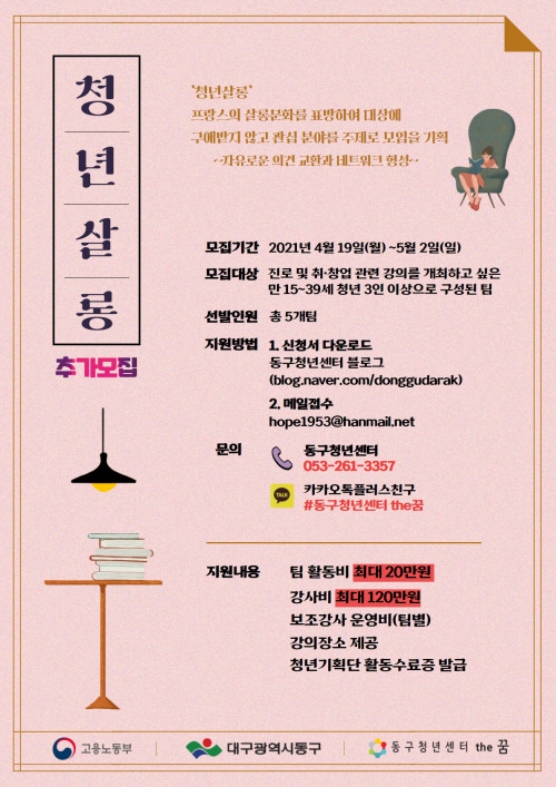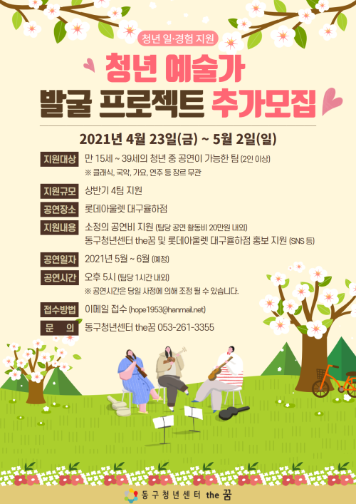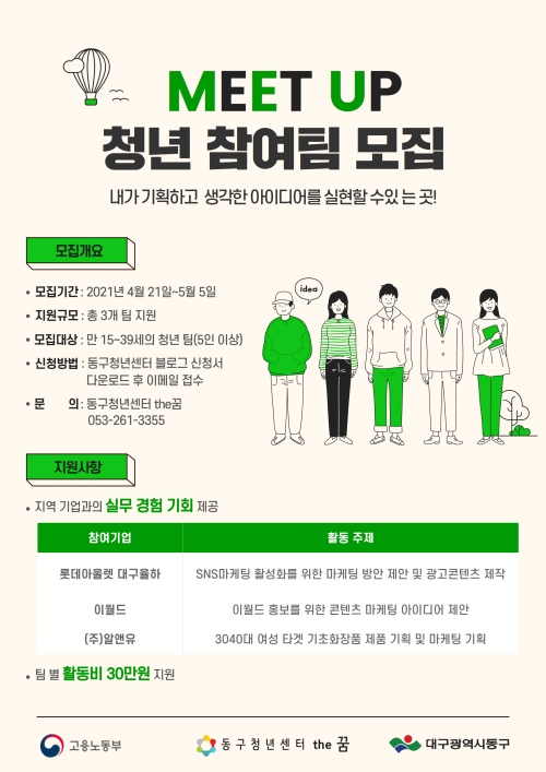 현재 모집 중 검색폼 대구광역시는 해당 페이지를 정보제공을 위한 목적으로 플랫폼을 운영하며, 각 게시글의 내용 및 운영방침에 대한 책임을 지지 않습니다. 대구광역시청년센터 사업 모아보기 전체보기 분야 : 전체 지원사업 채용/인턴/알바 기자단/서포터즈/자원봉사 공모전 교육/강연/토론 축제/공연/전시 커뮤니티활동 기타 정렬 : 전체 신규등록순 모집마감순 상태 : 전체 진행중 종료 기간 설정 검색 검색어 입력 꿀정보등록 누구나 쉽고 빠르게 청년정보를 등록하여 홍보할 수 있습니다. 전체선택 종료 2021 국비무료_대구창조경제혁신센터와 연계한 <대구 여성 창업융합 패키지 사업> 달구벌여성인력개발센터 ~ 2021.05.07 종료 2021 북미대학 진학 성공전략 (주)타임리 ~ 2021.05.06 종료 2021년 대구 독립운동 발자취를 따라 떠나는 시간여행자_대구지방보훈청 후원 메세지팩토리협동조합 ~ 2021.05.05 종료 2021 MEET UP 청년 참여팀 모집 동구청년센터 the꿈 ~ 2021.05.05 종료 2021 골목소식 크리에이터 과정 중구 동산동 도시재생현장지원센터 ~ 2021.05.05 종료 2021 청년취업지원 ‘취업(Cheer) UP!’ 추가모집 동구청년센터 the꿈 ~ 2021.05.02 종료 2021 청년 일·경험지원 '청년예술가 발굴 프로젝트' 추가모집 동구청년센터 the꿈 ~ 2021.05.02 종료 2021 청년성장지원 '청년살롱' 청년기획단 추가모집 대구동구청년센터 the꿈 ~ 2021.05.02 711 712 713 714 715 716 717 718 719 720