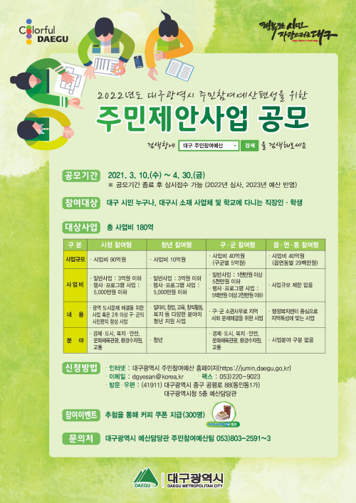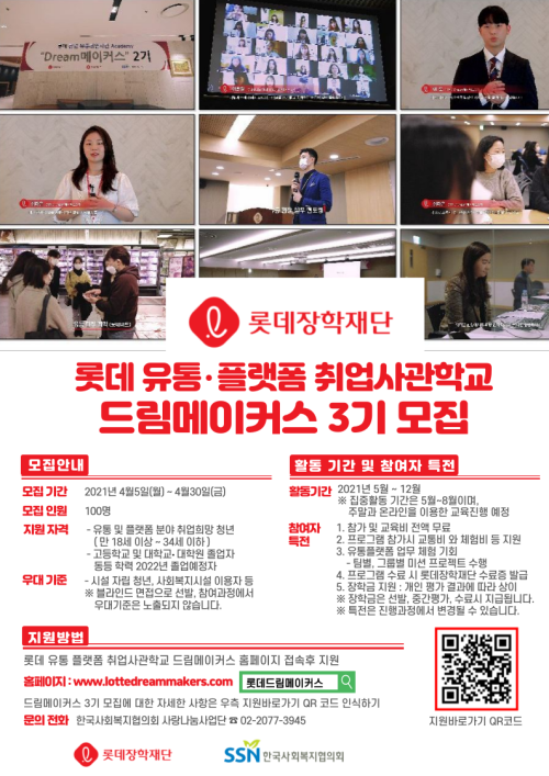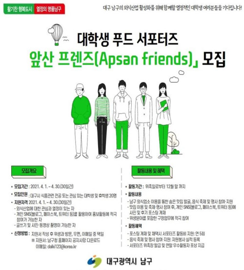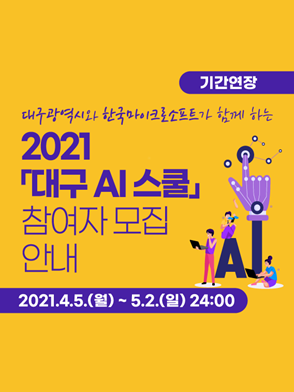 현재 모집 중 검색폼 대구광역시는 해당 페이지를 정보제공을 위한 목적으로 플랫폼을 운영하며, 각 게시글의 내용 및 운영방침에 대한 책임을 지지 않습니다. 대구광역시청년센터 사업 모아보기 전체보기 분야 : 전체 지원사업 채용/인턴/알바 기자단/서포터즈/자원봉사 공모전 교육/강연/토론 축제/공연/전시 커뮤니티활동 기타 정렬 : 전체 신규등록순 모집마감순 상태 : 전체 진행중 종료 기간 설정 검색 검색어 입력 꿀정보등록 누구나 쉽고 빠르게 청년정보를 등록하여 홍보할 수 있습니다. 전체선택 종료 2021 대구시와 한국마이크로소프트가 함께 하는 대구 AI 스쿨 참여자 추가모집 공고 (사)비영리IT지원센터 ~ 2021.05.02 종료 2021 지역밀착형 연구활동 지원사업 대학 연구 및 창업동아리 모집 공고 대구테크노파크 디지털융합센터 ~ 2021.04.30 종료 2021 소외계층 청년 취업지원 프로그램 드림메이커스 3기 모집 한국사회복지협의회 ~ 2021.04.30 종료 2021[우린 이렇게 왔다]대표저자들과의 만남 (주)타임리 ~ 2021.04.30 종료 2021 청년톡톡_걷기챌린지 기프티콘증정 이벤트 대구청년사회서비스사업단 ~ 2021.04.30 종료 2021 청년톡톡_무료 온라인PT 대구청년사회서비스사업단 ~ 2021.04.30 종료 2021 대학생 푸드 서포터즈 「앞산 프렌즈(Apsan friends)」 모집 대구광역시 남구청 ~ 2021.04.30 종료 2022년 주민제안사업(주민참여예산) 공모 대구광역시 예산담당관 ~ 2021.04.30 711 712 713 714 715 716 717 718 719 720