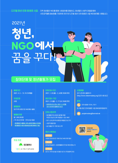 현재 모집 중 검색폼 대구광역시는 해당 페이지를 정보제공을 위한 목적으로 플랫폼을 운영하며, 각 게시글의 내용 및 운영방침에 대한 책임을 지지 않습니다. 대구광역시청년센터 사업 모아보기 전체보기 분야 : 전체 지원사업 채용/인턴/알바 기자단/서포터즈/자원봉사 공모전 교육/강연/토론 축제/공연/전시 커뮤니티활동 기타 정렬 : 전체 신규등록순 모집마감순 상태 : 전체 진행중 종료 기간 설정 검색 검색어 입력 꿀정보등록 누구나 쉽고 빠르게 청년정보를 등록하여 홍보할 수 있습니다. 전체선택 종료 2021 해결사(해외아동결연을 통해 세상을 변화시키는 사람들) 모집[굿네이버스 대구경북본부] 굿네이버스 대구경북본부 ~ 2021.02.26 종료 2021 청년마을 만들기 지원사업 행정안전부 ~ 2021.02.26 종료 2021 재도전성공패키지 참여 (예비)재창업자 모집 중소벤처기업부 / 대구창조경제혁신센터 ~ 2021.02.25 종료 2021 대학생자원봉사동아리 한빛 모집[굿네이버스 대구경북본부] 굿네이버스 대구경북본부 ~ 2021.02.24 종료 2021 소통의 어려움과 비대면 회의 도구에 관한 강연 어울리 ~ 2021.02.23 종료 2021 대구시민주간 시민공모전 대구시 문화예술정책과 / 대구문화재단 ~ 2021.02.21 종료 2021 대구광역시 서구 청년정책위원회 위원 모집 ! 대구광역시 서구청 ~ 2021.02.19 대구광역시청년센터 종료 2021 대구광역시청년센터 인재채용 대구광역시청년센터 ~ 2021.02.18 731 732 733 734 735 736 737 738 739 740