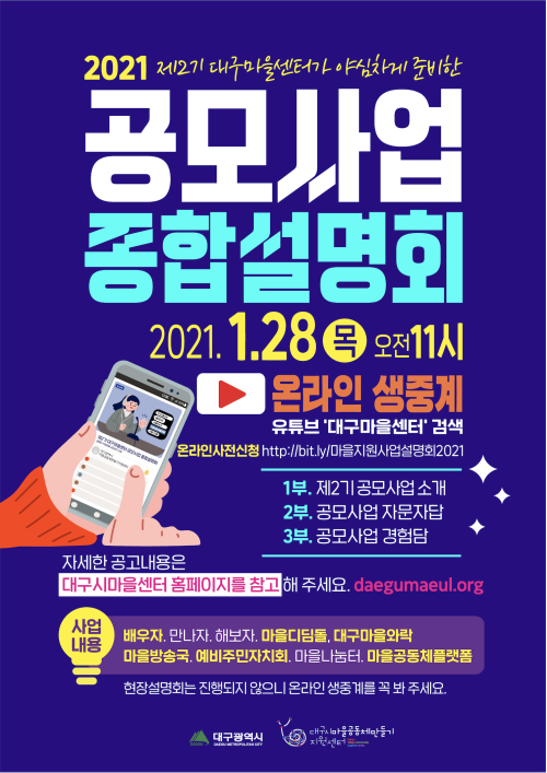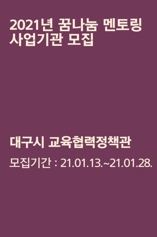 현재 모집 중 검색폼 대구광역시는 해당 페이지를 정보제공을 위한 목적으로 플랫폼을 운영하며, 각 게시글의 내용 및 운영방침에 대한 책임을 지지 않습니다. 대구광역시청년센터 사업 모아보기 전체보기 분야 : 전체 지원사업 채용/인턴/알바 기자단/서포터즈/자원봉사 공모전 교육/강연/토론 축제/공연/전시 커뮤니티활동 기타 정렬 : 전체 신규등록순 모집마감순 상태 : 전체 진행중 종료 기간 설정 검색 검색어 입력 꿀정보등록 누구나 쉽고 빠르게 청년정보를 등록하여 홍보할 수 있습니다. 전체선택 대구광역시청년센터 종료 2021 청년공동체활성화사업 모집공고 대구광역시청년센터 ~ 2021.02.14 종료 2021 청년마을 만들기 지원사업 비대면 사업설명회 행정안전부 ~ 2021.02.05 종료 2021 제주더큰내일센터 4기 참여자 모집! 월 150만 지원받으며 취업,창업 준비 제주더큰내일센터 ~ 2021.02.04 종료 2021 「창의공간, 온」 공간지킴이(공간 관리 인원) 모집 대구 창의도시재생지원센터 ~ 2021.02.03 종료 2021 도시재생연계리빙랩 코디네이터 양성과정 참여자 모집 협동조합 소이랩 ~ 2021.01.31 대구광역시청년센터 종료 2021 디지털 활용 청년일자리 YES!매칭 대구광역시청년센터 ~ 2021.01.30 종료 2021 대구시 마을지원공모사업 종합설명회 대구시 마을공동체만들기지원사업 ~ 2021.01.28 종료 2021 꿈나눔 멘토링 사업기관 모집 대구광역시 교육협력정책관 ~ 2021.01.28 731 732 733 734 735 736 737 738 739 740