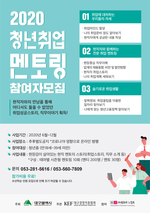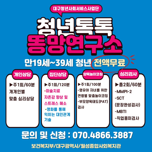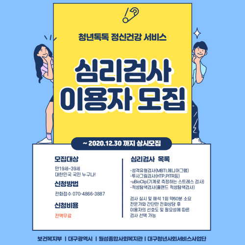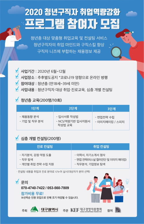 현재 모집 중 검색폼 대구광역시는 해당 페이지를 정보제공을 위한 목적으로 플랫폼을 운영하며, 각 게시글의 내용 및 운영방침에 대한 책임을 지지 않습니다. 대구광역시청년센터 사업 모아보기 전체보기 분야 : 전체 지원사업 채용/인턴/알바 기자단/서포터즈/자원봉사 공모전 교육/강연/토론 축제/공연/전시 커뮤니티활동 기타 정렬 : 전체 신규등록순 모집마감순 상태 : 전체 진행중 종료 기간 설정 검색 검색어 입력 꿀정보등록 누구나 쉽고 빠르게 청년정보를 등록하여 홍보할 수 있습니다. 전체선택 종료 2020 아이디어 빌딩을 위한 'Clutch Day' 시작합니다. 대구창조경제혁신센터 ~ 2020.12.31 종료 2020 청년취업성공지원 '취업했수당' (취업성공금 지급) 대구동구청년센터 the꿈 ~ 2020.12.31 종료 2020 청년톡톡 무료심리검사 이용자모집 월성종합사회복지관 ~ 2020.12.31 종료 2020 대구청년사회서비스사업 이용자 모집(전액무료) 대구청년사회서비스사업단 ~ 2020.12.31 종료 2020 청년취업 멘토링 프로그램 주최:대구광역시 / 주관:대구경영자총협회 ~ 2020.12.31 종료 2020 청년구직자 취업역량강화 프로그램 대구경영자총협회 ~ 2020.12.31 종료 2020 대구청년사회서비스사업단 대구청년사회서비스사업단 ~ 2020.12.31 종료 2020 청년귀환 프로젝트 '욜로온나' 대구광역시 / 대구창조경제혁신센터 ~ 2020.12.31 731 732 733 734 735 736 737 738 739 740