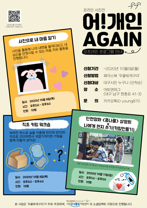 현재 모집 중 검색폼 대구광역시는 해당 페이지를 정보제공을 위한 목적으로 플랫폼을 운영하며, 각 게시글의 내용 및 운영방침에 대한 책임을 지지 않습니다. 대구광역시청년센터 사업 모아보기 전체보기 분야 : 전체 지원사업 채용/인턴/알바 기자단/서포터즈/자원봉사 공모전 교육/강연/토론 축제/공연/전시 커뮤니티활동 기타 정렬 : 전체 신규등록순 모집마감순 상태 : 전체 진행중 종료 기간 설정 검색 검색어 입력 꿀정보등록 누구나 쉽고 빠르게 청년정보를 등록하여 홍보할 수 있습니다. 전체선택 종료 2020 'How are you?' 1:1 전문상담 참여자 모집 동구청년센터 the꿈 ~ 2020.10.15 종료 2020 대학리크루트 투어 2주차 행사 대구광역시 원스톱일자리지원센터 ~ 2020.10.14 종료 [2020 대구실패박람회] 온라인 서포터즈 '일어나 챌린저' 모집 행정안전부, 대구광역시, 2020대구실패박람회추진위원회 ~ 2020.10.11 종료 2020 멘토식탁 X 청년사진관 (취업사진 무료촬영) 대구동구청년센터 the꿈 ~ 2020.10.09 종료 2020 '멘토식탁' 5차, 6차, 7차 참여자 모집 대구동구청년센터 the꿈 ~ 2020.10.09 종료 2020 여러분의 경북대 대학로 스토리를 들려주세요! 스토리발굴 워크숍 참여자 모집! 어울리(Eoulli) ~ 2020.10.08 종료 2020 온라인 사진전 『어!개인 AGAIN』 오프라인 프로그램 참가신청 우물밖개구리 ~ 2020.10.08 종료 2020 대한민국 테마여행10선 청년선비해설가 3기 모집 대구관광뷰로 ~ 2020.10.08 741 742 743 744 745 746 747 748 749 750