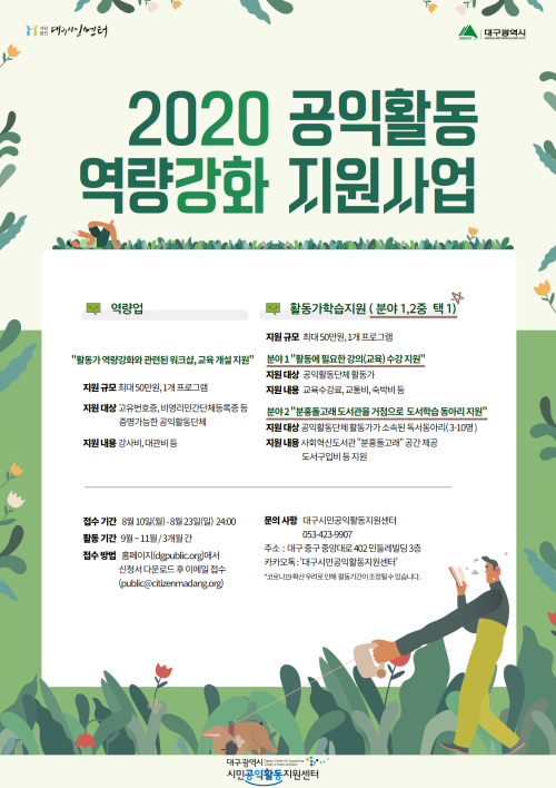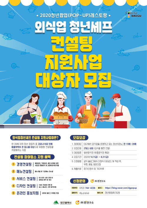 현재 모집 중 검색폼 대구광역시는 해당 페이지를 정보제공을 위한 목적으로 플랫폼을 운영하며, 각 게시글의 내용 및 운영방침에 대한 책임을 지지 않습니다. 대구광역시청년센터 사업 모아보기 전체보기 분야 : 전체 지원사업 채용/인턴/알바 기자단/서포터즈/자원봉사 공모전 교육/강연/토론 축제/공연/전시 커뮤니티활동 기타 정렬 : 전체 신규등록순 모집마감순 상태 : 전체 진행중 종료 기간 설정 검색 검색어 입력 꿀정보등록 누구나 쉽고 빠르게 청년정보를 등록하여 홍보할 수 있습니다. 전체선택 종료 2020 제 19회 대구시민원탁회의 대구광역시 ~ 2020.08.24 종료 2020 공익활동 역량강화 지원사업 '역량업'/'활동가학습지원' 추가 공모! 대구시민공익활동지원센터 ~ 2020.08.23 종료 2020 대구광역시 마을기업 설립 전 교육 참가자 모집 대구시청 ~ 2020.08.21 종료 2020 외식업 청년쉐프 컨설팅 지원사업 대상자 모집 공모 대구광역시/(주)핀연구소 ~ 2020.08.21 종료 2020 다문화쿠킹클래스 수강생 모집 <2탄 중국> 대구동구청년센터 the꿈 ~ 2020.08.20 종료 2020 청년강사 강의 참여자 모집 대구동구청년센터 the꿈 ~ 2020.08.20 종료 2020 우리가ON하는 대구 환경의제포럼 대구지역문제해결플랫폼 ~ 2020.08.19 대구광역시청년센터 종료 2020 다온나그래 기획프로그램<사부작클래스 시즌3> 수강생 모집 공고 대구광역시청년센터 ~ 2020.08.17 751 752 753 754 755 756 757 758 759 760