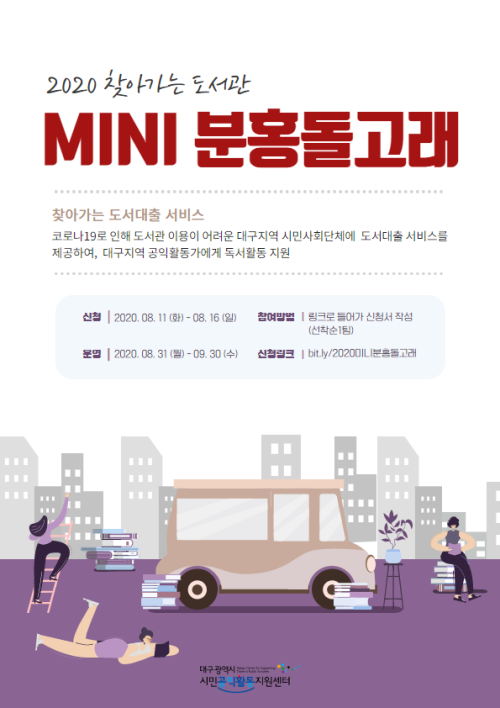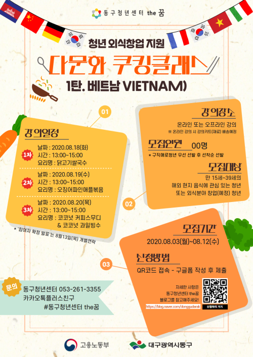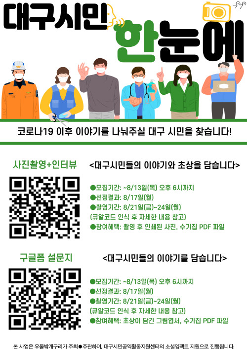 현재 모집 중 검색폼 대구광역시는 해당 페이지를 정보제공을 위한 목적으로 플랫폼을 운영하며, 각 게시글의 내용 및 운영방침에 대한 책임을 지지 않습니다. 대구광역시청년센터 사업 모아보기 전체보기 분야 : 전체 지원사업 채용/인턴/알바 기자단/서포터즈/자원봉사 공모전 교육/강연/토론 축제/공연/전시 커뮤니티활동 기타 정렬 : 전체 신규등록순 모집마감순 상태 : 전체 진행중 종료 기간 설정 검색 검색어 입력 꿀정보등록 누구나 쉽고 빠르게 청년정보를 등록하여 홍보할 수 있습니다. 전체선택 대구광역시청년센터 종료 2020 보라그래TV 온라인 이벤트(내말좀들어보라_취업 및 창업 편) 대구광역시청년센터 ~ 2020.08.17 종료 2020 찾아가는 도서관 MINI 분홍돌고래 참여자 모집 대구시민공익활동지원센터 ~ 2020.08.16 종료 2020 사회문제를 해결하는 공익활동 동아리 <공익메신저 2기> 모집! 대구시민공익활동지원센터 ~ 2020.08.14 종료 2020 제2회 수성 청년 축제 '수성은 청년이다' 대구시 수성구청 ~ 2020.08.14 종료 2020우물밖개구리 아템포 사진 전시회 참여자 모집 우물밖개구리 ~ 2020.08.13 종료 2020 다문화쿠킹클래스 수강생 모집 <1탄 베트남> 동구청년센터 the꿈 ~ 2020.08.12 대구광역시청년센터 종료 2020 다온나그래 사부작클래스 SEASON.3 에 함께 할 금손을 찾습니다! 대구광역시청년센터 ~ 2020.08.07 종료 2020 자유도시대구, 대프리구 청년 참가자 모집 대구광역시 / 대구창조경제혁신센터 ~ 2020.08.04 751 752 753 754 755 756 757 758 759 760