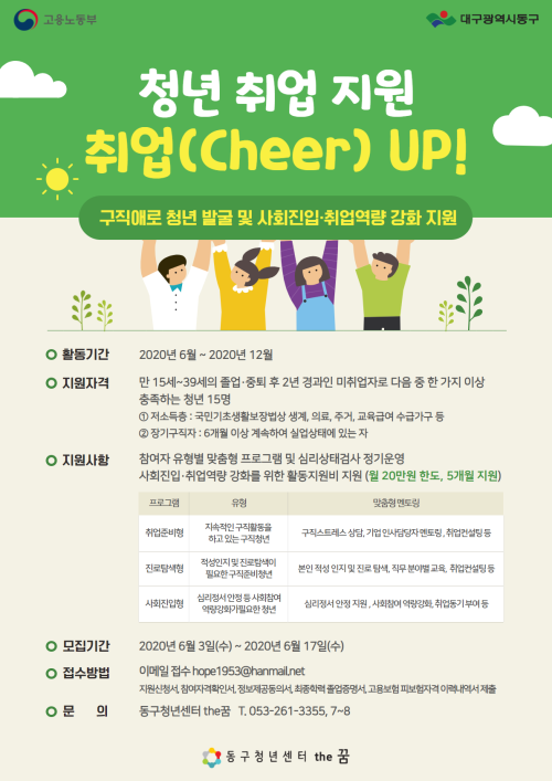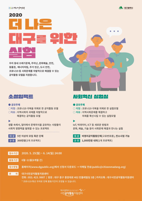 현재 모집 중 검색폼 대구광역시는 해당 페이지를 정보제공을 위한 목적으로 플랫폼을 운영하며, 각 게시글의 내용 및 운영방침에 대한 책임을 지지 않습니다. 대구광역시청년센터 사업 모아보기 전체보기 분야 : 전체 지원사업 채용/인턴/알바 기자단/서포터즈/자원봉사 공모전 교육/강연/토론 축제/공연/전시 커뮤니티활동 기타 정렬 : 전체 신규등록순 모집마감순 상태 : 전체 진행중 종료 기간 설정 검색 검색어 입력 꿀정보등록 누구나 쉽고 빠르게 청년정보를 등록하여 홍보할 수 있습니다. 전체선택 종료 2020 '청년 1인 가구' 대상 설문조사 대구북구건강가정다문화가족지원센터 ~ 2020.06.18 종료 2020 청년 취업 지원 '취업(Cheer) UP!' 추가모집 동구청년센터 the꿈 ~ 2020.06.17 종료 2020청년응원카페 참여청년모집! (2차) (주)문화뱅크 / 대구광역시 ~ 2020.06.16 종료 2020 청년 창업 지원 '야금야금' 참여자 추가모집! 동구청년센터 the꿈 ~ 2020.06.14 종료 2020 더 나은 대구를 위한 실험! 사회혁신실험실/소셜임팩트 2차 공모 대구시민공익활동지원센터 ~ 2020.06.14 종료 2020 CJ CGV X 문화상점가(街) 플리마켓 셀러 모집 (주)유니언플레이스 ~ 2020.06.12 종료 2020 청년여성 멘토링 프로젝트 멘티 모집 대구광역시/대구여성가족재단 ~ 2020.06.12 종료 [모집기간 연장] 2020 코로나19극복 미취업청년 응원상품권 지원사업 참가자 모집 대구광역시 ~ 2020.06.12 761 762 763 764 765 766 767 768 769 770