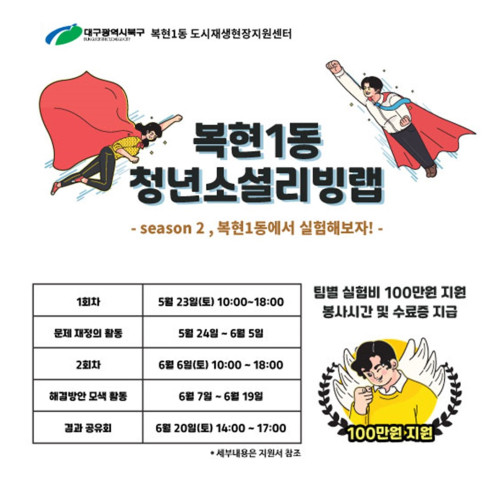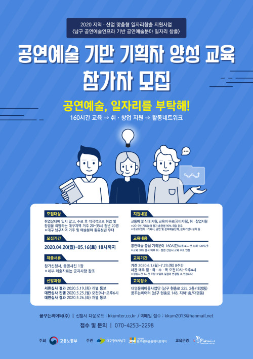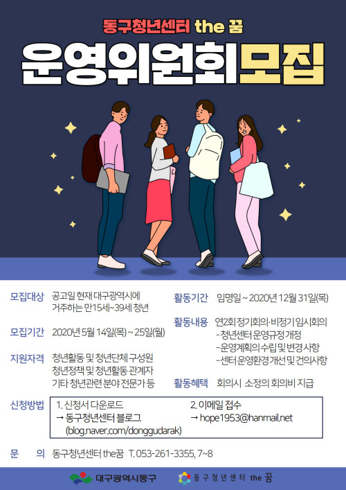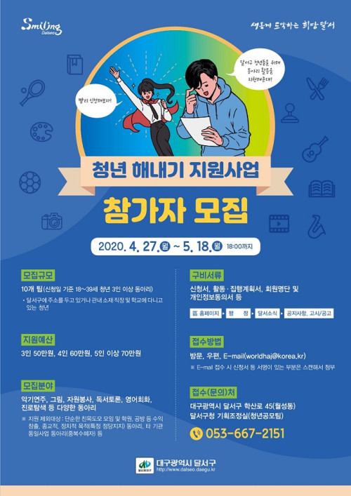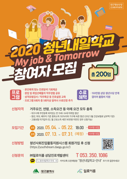 현재 모집 중 검색폼 대구광역시는 해당 페이지를 정보제공을 위한 목적으로 플랫폼을 운영하며, 각 게시글의 내용 및 운영방침에 대한 책임을 지지 않습니다. 대구광역시청년센터 사업 모아보기 전체보기 분야 : 전체 지원사업 채용/인턴/알바 기자단/서포터즈/자원봉사 공모전 교육/강연/토론 축제/공연/전시 커뮤니티활동 기타 정렬 : 전체 신규등록순 모집마감순 상태 : 전체 진행중 종료 기간 설정 검색 검색어 입력 꿀정보등록 누구나 쉽고 빠르게 청년정보를 등록하여 홍보할 수 있습니다. 전체선택 종료 2020 동구청년센터 the꿈 운영위원회 모집 동구청년센터 the꿈 ~ 2020.05.25 종료 2020 청년내일학교 상반기 참여자 모집 대구광역시/(주)일로이룸 ~ 2020.05.22 대구광역시청년센터 종료 [2020 대구청년센터 유튜브채널] 보라그래TV 오픈 이벤트! 대구광역시청년센터 ~ 2020.05.21 종료 2020 슬기로운 집콕생활 챌린지(코로나긴급지원) 크리에이터 커뮤니티 저녁 ~ 2020.05.19 종료 2020 복현1동 청년소셜리빙랩 복현1동 도시재생현장지원센터 ~ 2020.05.18 종료 2020 청년 해내기 지원사업 참가자 모집 달서구청 ~ 2020.05.18 대구광역시청년센터 종료 2020 코로나 집콕생활 온라인캠페인 '코로나19 대처유형 3가지' 대구광역시청년센터 ~ 2020.05.17 종료 2020 지역 산업 맞춤형 일자리창출 지원사업 - 공연예술기반 기획자 양성교육 참가자 모집 꿈꾸는씨어터 ~ 2020.05.16 761 762 763 764 765 766 767 768 769 770