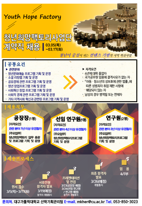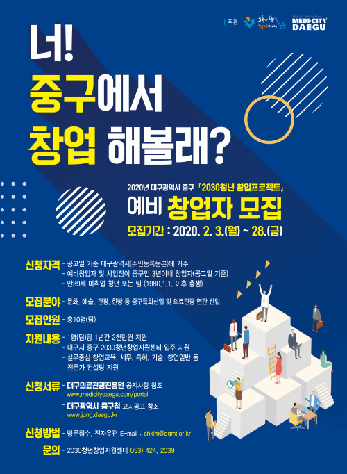 현재 모집 중 검색폼 대구광역시는 해당 페이지를 정보제공을 위한 목적으로 플랫폼을 운영하며, 각 게시글의 내용 및 운영방침에 대한 책임을 지지 않습니다. 대구광역시청년센터 사업 모아보기 전체보기 분야 : 전체 지원사업 채용/인턴/알바 기자단/서포터즈/자원봉사 공모전 교육/강연/토론 축제/공연/전시 커뮤니티활동 기타 정렬 : 전체 신규등록순 모집마감순 상태 : 전체 진행중 종료 기간 설정 검색 검색어 입력 꿀정보등록 누구나 쉽고 빠르게 청년정보를 등록하여 홍보할 수 있습니다. 전체선택 종료 2020 청년희망팩토리사업단 계약직 채용 대구가톨릭대학교 산학기획관리팀 ~ 2020.03.17 종료 (취소) 2020 청년들이 살기 좋은 마을 만들기 및 청년활력 지원사업 공모설명회 개최 행정안전부 주민참여헙업과 ~ 2020.03.16 종료 2020 인공지능/블록체인 교육받고 취뽀까지 한 번에~! 한국표준협회 ~ 2020.03.13 종료 2020 청년공동체 활성화 사업 참여자 모집 행정안전부 지역공동체과 ~ 2020.03.13 종료 2020 대구광역시 중구 2030청년창업지원사업 (예비)창업자 모집(★접수연장) 2030청년창업지원센터, 대구광역시 중구청, 대구의료관광진흥원 ~ 2020.03.13 대구광역시청년센터 종료 2020 청년사업장-청년잇기 프로젝트 YES!매칭 대구광역시청년센터 ~ 2020.03.13 종료 2020 한상기업 청년채용 인턴십 재외동포재단 ~ 2020.03.08 종료 2020 대구자원봉사 우수프로그램 공모사업 대구광역시ㆍ구ㆍ군자원봉사센터 ~ 2020.03.06 771 772 773 774 775 776