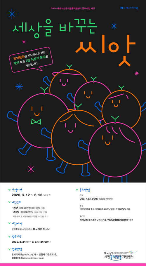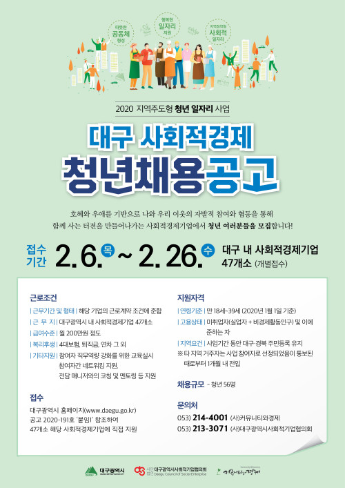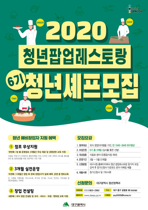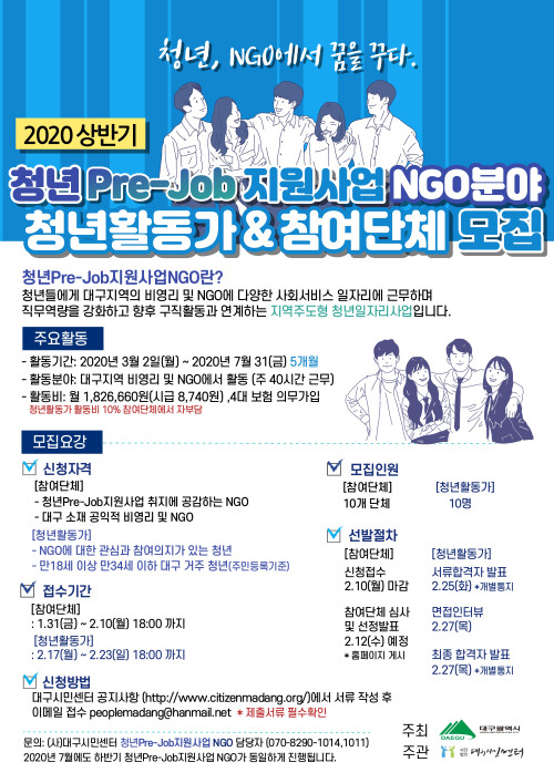 현재 모집 중 검색폼 대구광역시는 해당 페이지를 정보제공을 위한 목적으로 플랫폼을 운영하며, 각 게시글의 내용 및 운영방침에 대한 책임을 지지 않습니다. 대구광역시청년센터 사업 모아보기 전체보기 분야 : 전체 지원사업 채용/인턴/알바 기자단/서포터즈/자원봉사 공모전 교육/강연/토론 축제/공연/전시 커뮤니티활동 기타 정렬 : 전체 신규등록순 모집마감순 상태 : 전체 진행중 종료 기간 설정 검색 검색어 입력 꿀정보등록 누구나 쉽고 빠르게 청년정보를 등록하여 홍보할 수 있습니다. 전체선택 대구광역시청년센터 종료 2020 대구청년학교 딴길학과개설자 모집 대구광역시 청년센터 ~ 2020.03.01 종료 2020 상반기 씨앗 공모사업 대구시민공익활동지원센터 ~ 2020.03.01 종료 2020 청년 팝업 레스토랑 6기 참가청년 모집 대구광역시 ~ 2020.02.28 종료 2020 '청년 학자금 상환 플랫폼' 참여청년 모집! 재단법인 청년재단 ~ 2020.02.26 종료 2020 지역주도형 청년일자리사업 채용공고(사회적경제 청년인턴) 대구광역시 ~ 2020.02.26 종료 2020 시민중심 현안의제 발굴 댓글달기 이벤트 대구광역시청 ~ 2020.02.25 종료 2020 청년 Pre-Jop 지원사업 NGO 분야 대구시민센터 ~ 2020.02.23 종료 2020 K-ICT창업멘토링센터 상반기 전담멘티(14기) 모집 (재)한국청년기업가정신재단 ~ 2020.02.21 771 772 773 774 775 776