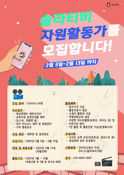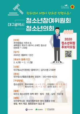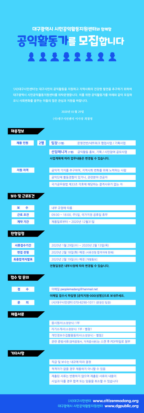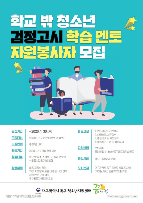 현재 모집 중 검색폼 대구광역시는 해당 페이지를 정보제공을 위한 목적으로 플랫폼을 운영하며, 각 게시글의 내용 및 운영방침에 대한 책임을 지지 않습니다. 대구광역시청년센터 사업 모아보기 전체보기 분야 : 전체 지원사업 채용/인턴/알바 기자단/서포터즈/자원봉사 공모전 교육/강연/토론 축제/공연/전시 커뮤니티활동 기타 정렬 : 전체 신규등록순 모집마감순 상태 : 전체 진행중 종료 기간 설정 검색 검색어 입력 꿀정보등록 누구나 쉽고 빠르게 청년정보를 등록하여 홍보할 수 있습니다. 전체선택 종료 2020 대구 청년사회서비스사업단 인력 채용 공고 월성종합사회복지관 ~ 2020.02.20 종료 2020 누리라프로젝트 7기 구성원 모집 누리라프로젝트 ~ 2020.02.20 종료 2020 대구광역시청소년의회. 참여위원회 모집 대구청소년활동진흥센터 ~ 2020.02.17 종료 2020 솔라티비 자원활동가 모집 솔라티비 비영리단체 ~ 2020.02.13 종료 2020 대구광역시 시민공익활동지원센터와 함께할 공익활동가를 모집합니다. (사)대구시민센터 ~ 2020.02.13 종료 2020 제주더큰내일센터 탐나는 인재 2기 모집 제주더큰내일센터 ~ 2020.02.05 대구광역시청년센터 종료 2020 대구청년활력공간 대구광역시청년센터 ~ 2020.02.04 종료 2020 학교 밖 청소년 검정고시 학습 멘토 자원봉사자 모집 대구 동구청소년지원센터 꿈드림 ~ 2020.01.30 771 772 773 774 775 776
