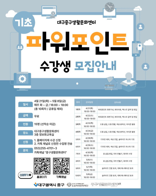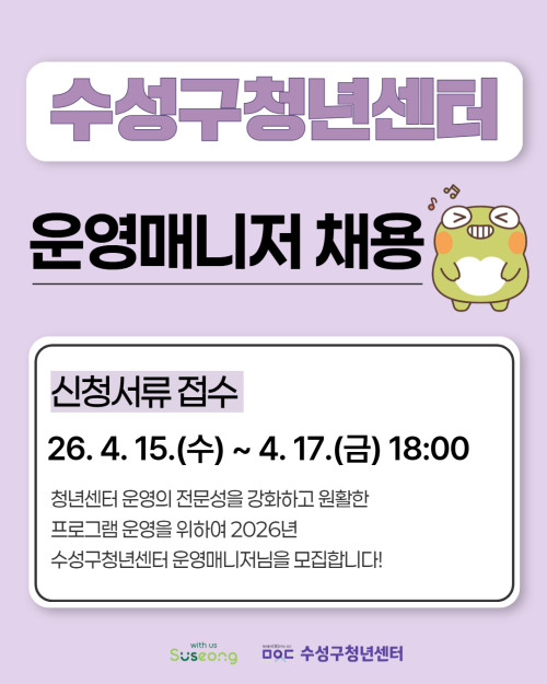 현재 모집 중 검색폼 대구광역시는 해당 페이지를 정보제공을 위한 목적으로 플랫폼을 운영하며, 각 게시글의 내용 및 운영방침에 대한 책임을 지지 않습니다. 대구광역시청년센터 사업 모아보기 전체보기 분야 : 전체 지원사업 채용/인턴/알바 기자단/서포터즈/자원봉사 공모전 교육/강연/토론 축제/공연/전시 커뮤니티활동 기타 정렬 : 전체 신규등록순 모집마감순 상태 : 전체 진행중 종료 기간 설정 검색 검색어 입력 꿀정보등록 누구나 쉽고 빠르게 청년정보를 등록하여 홍보할 수 있습니다. 전체선택 진행중 [2026년 칠곡 청년정책참여단] 모집 칠곡군 청년센터 ~ 2026.04.16 진행중 2026 상반기 수성구청년센터 운영매니저 채용공고 수성구청년센터 ~ 2026.04.17 진행중 [안양청년1번가] 2026 청년 로컬 연구 프로젝트 참여자 모집 안양청년1번가 ~ 2026.04.17 진행중 2·28청년아카데미 제9기 수강생 모집 2·28민주운동기념사업회 ~ 2026.04.17 진행중 2026년 청년사업자 임대료 지원사업 대구광역시 중구 ~ 2026.04.17 진행중 2026 청년도전지원사업 '젊핑' 중기(15주) 시즌2 프로그램 참여자 모집 대구광역시청년센터 ~ 2026.04.17 진행중 [정규과정] 파워포인트 기초반 대구중구생활문화센터 ~ 2026.04.18 진행중 [클라우드세미나] Global Azure Bootcamp 2026 in Daegu 대구/경북 개발자 AI 커뮤니티 맞다AI가 ~ 2026.04.18 1 2 3 4 5 6 7 8 9 10