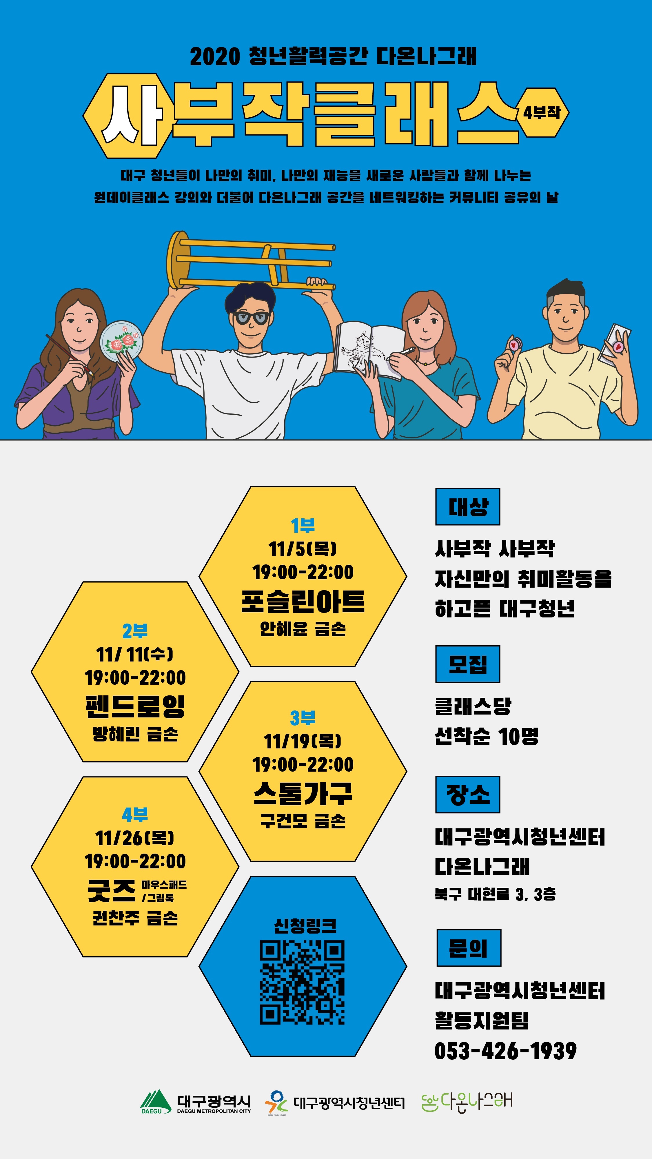 2020 다온나그래 기획프로그램<사부작클래스 11월> 수강생 모집 공고작성자 : 관리자 작성일 : 20-11-03 대구광역시청년센터