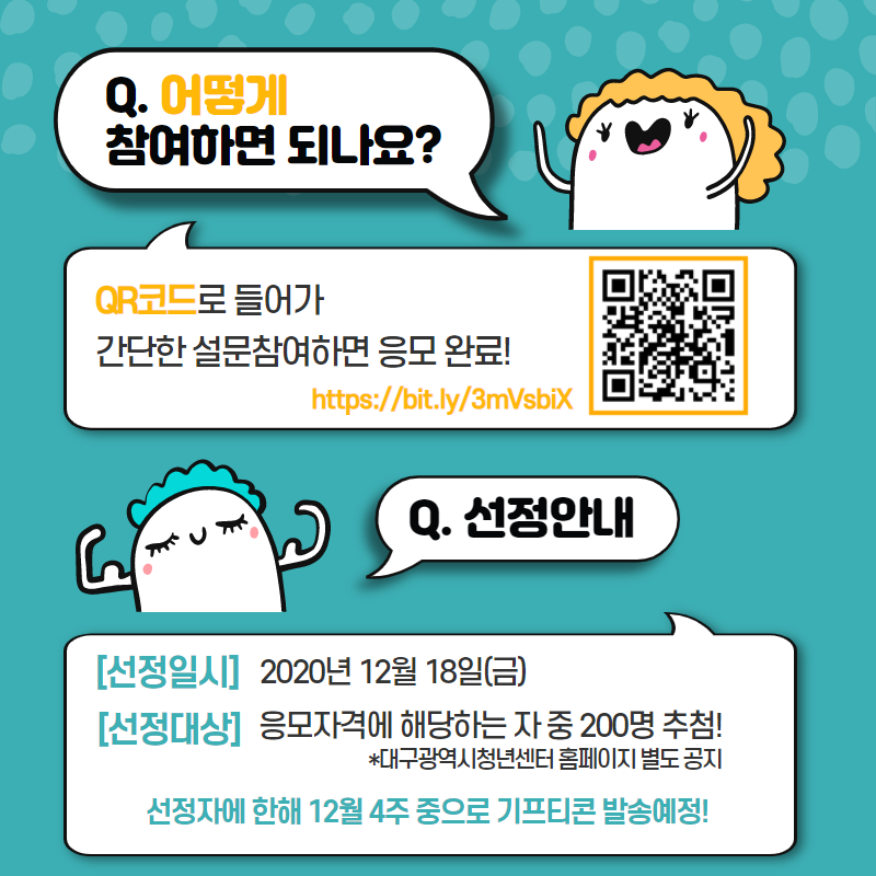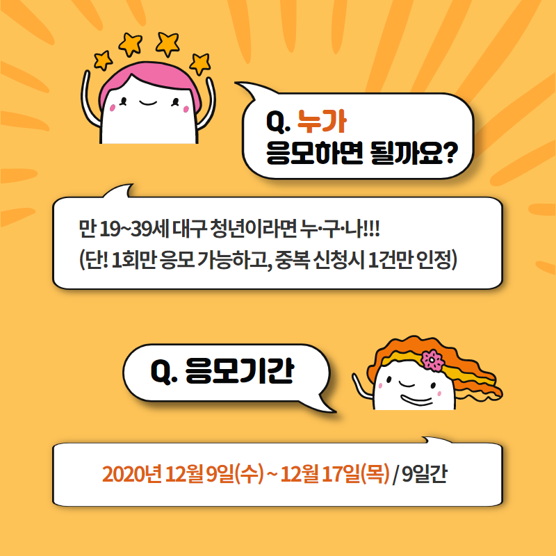 - 응모일시: 2020년 12월 9일(수) ~ 12월 17일(목) / 9일간- 응모대상: 19~39세 대구 청년 누구나! (1회만 응모가능, 여러 번 응모 시 최초 1회로 진행)