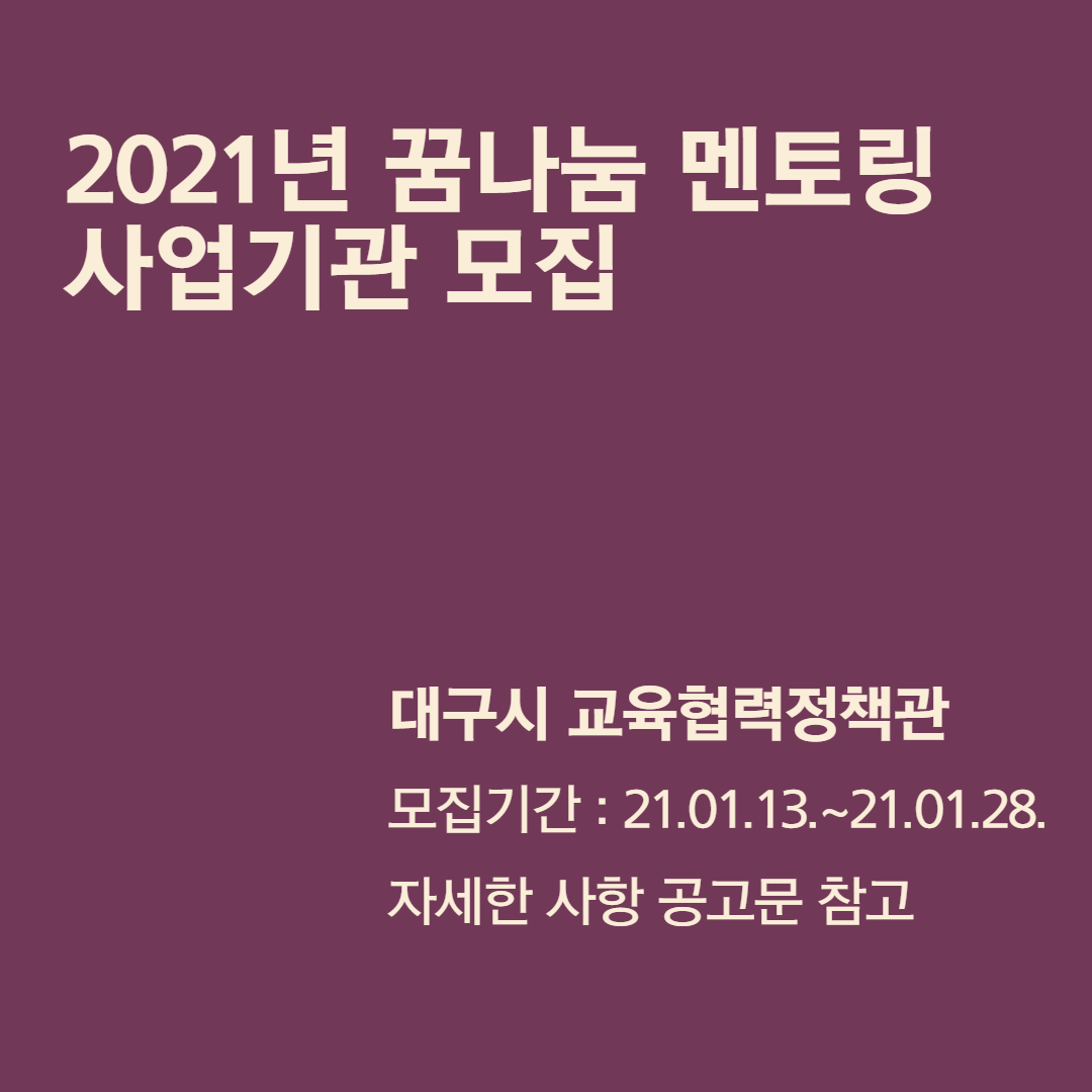 2021 꿈나눔 멘토링 사업기관 모집작성자 : 백기명 작성일 : 21-01-13