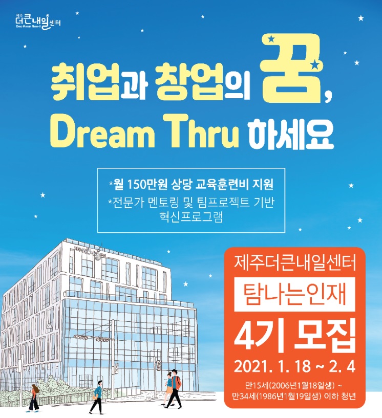 2021 제주더큰내일센터 4기 참여자 모집! 월 150만 지원받으며 취업,창업 준비작성자 : 정지수 작성일 : 21-01-20