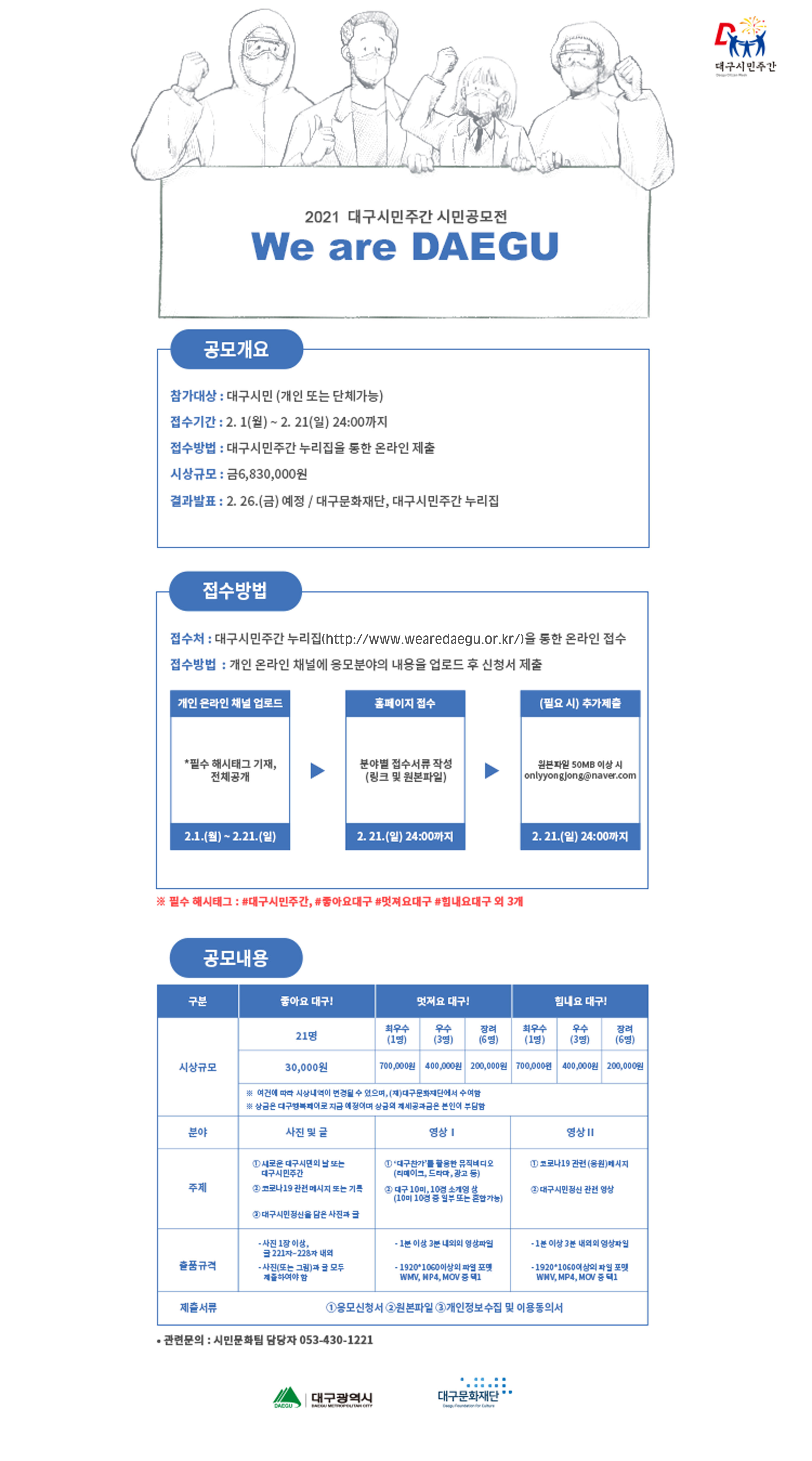 신청방법 : 첨부된 신청서를 대구시민주간 누리집(http://www.wearedaegu.or.kr/)에서 온라인 제출!