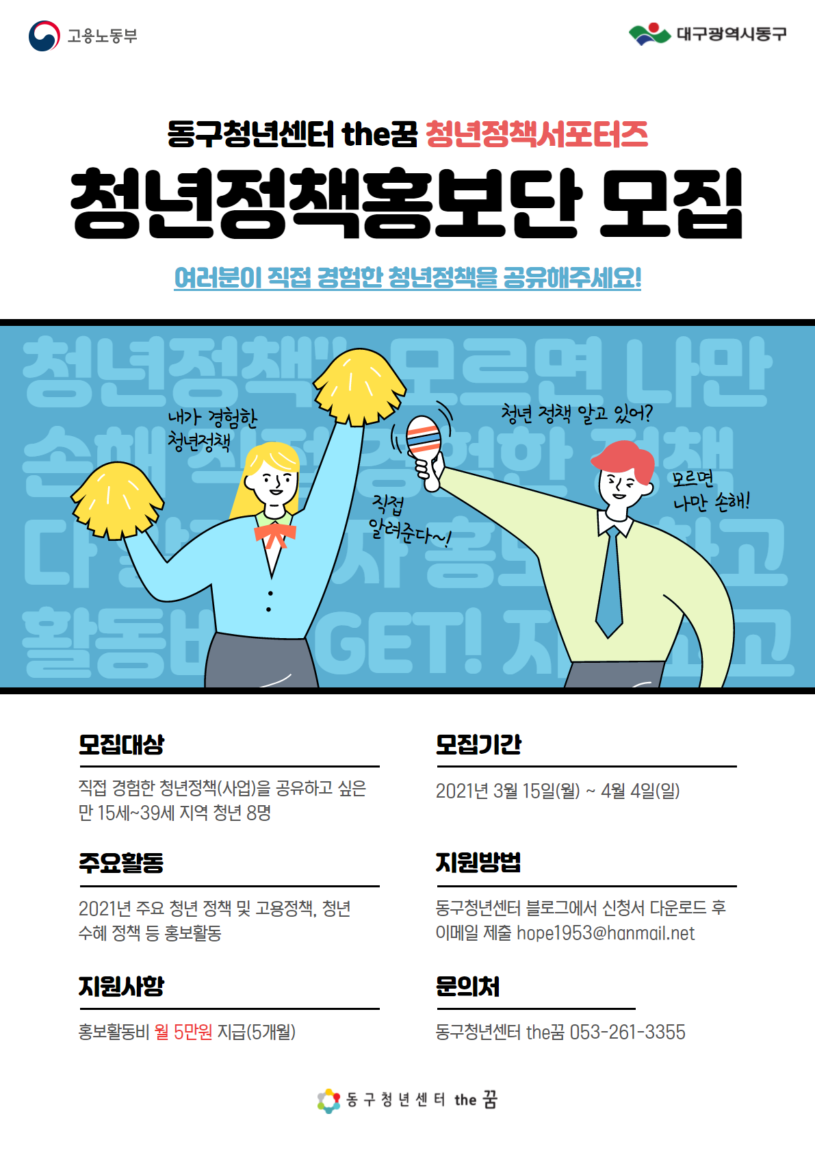 동구청년센터 the꿈 053-261-3355, 7~8 / 카카오톡플러스친구 ‘동구청년센터 the꿈’