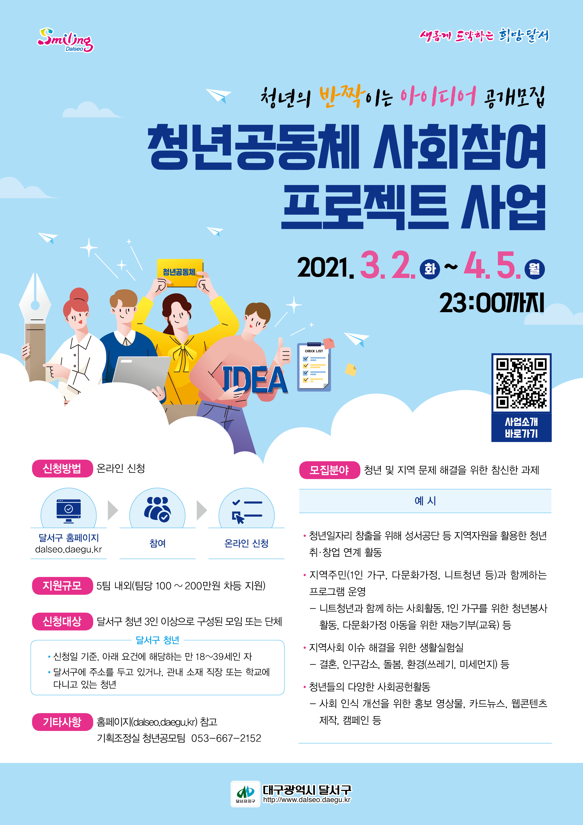 2021년 청년공동체 사회참여 프로젝트 사업(모집연장)작성자 : 이예림 작성일 : 21-03-26