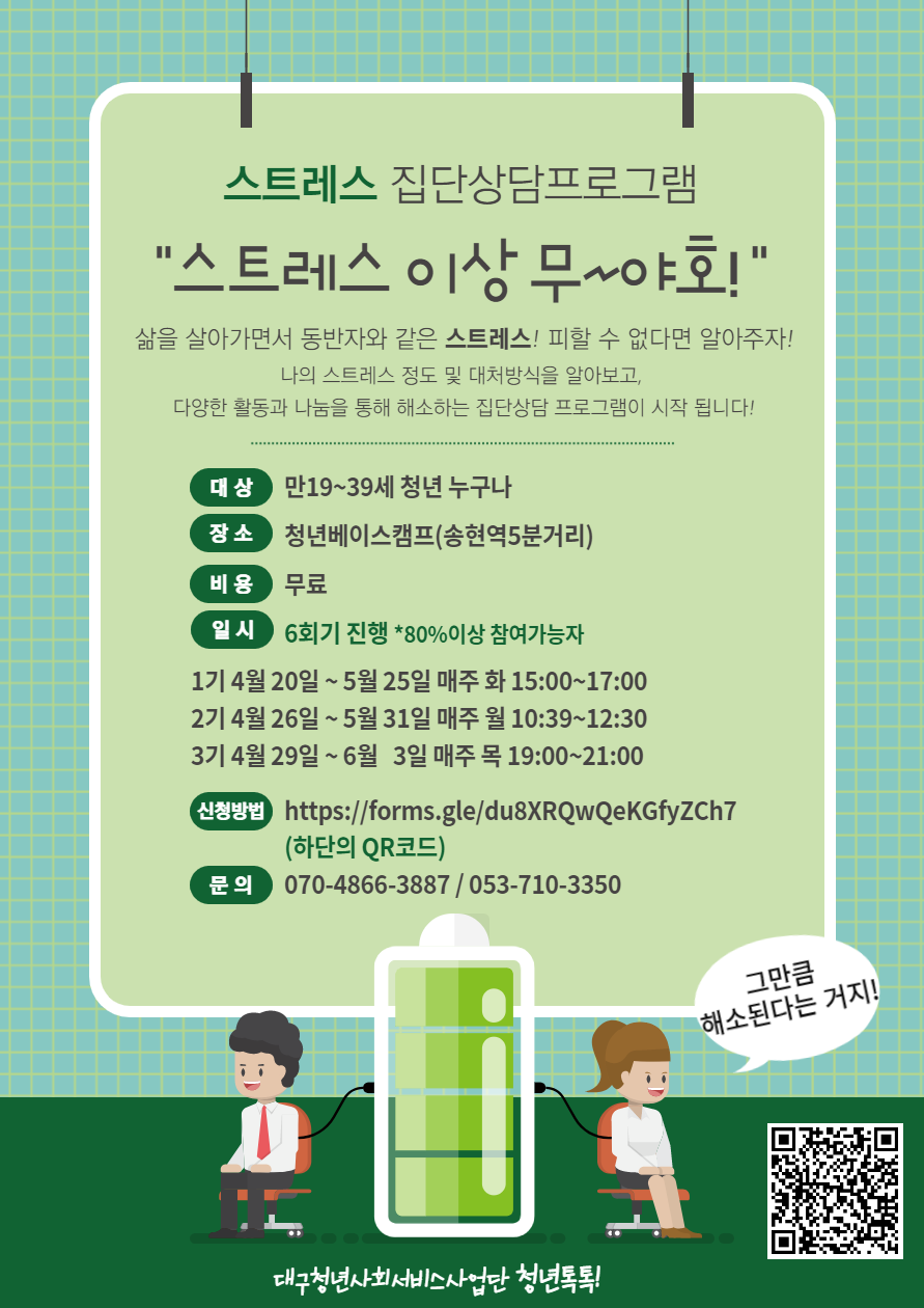 2021 [추가모집] 스트레스 집단상담 프로그램 '스트레스이상무~야호!' 참여자 모집 안내작성자 : 박해리 작성일 : 21-04-13