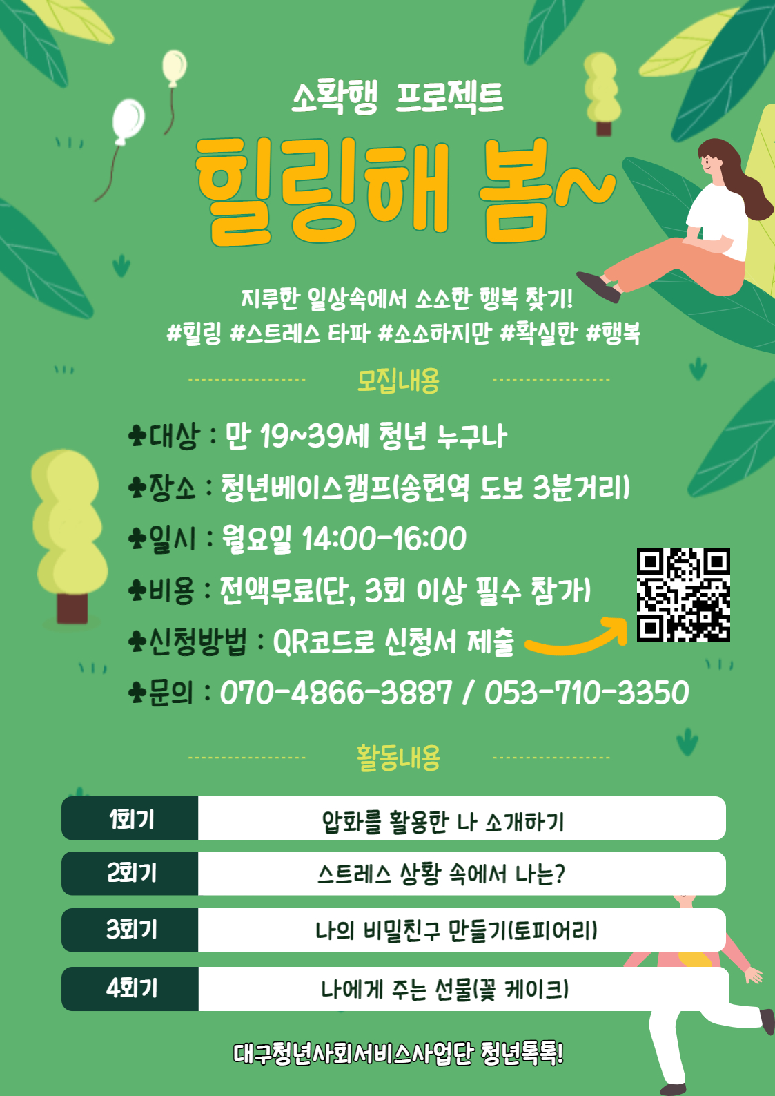 소확행 프로젝트 '힐링해봄~'을 통해 작지만 확실한 행복을 찾고 함께 스트레스 날려버릴 여러분을 기다립니다!
